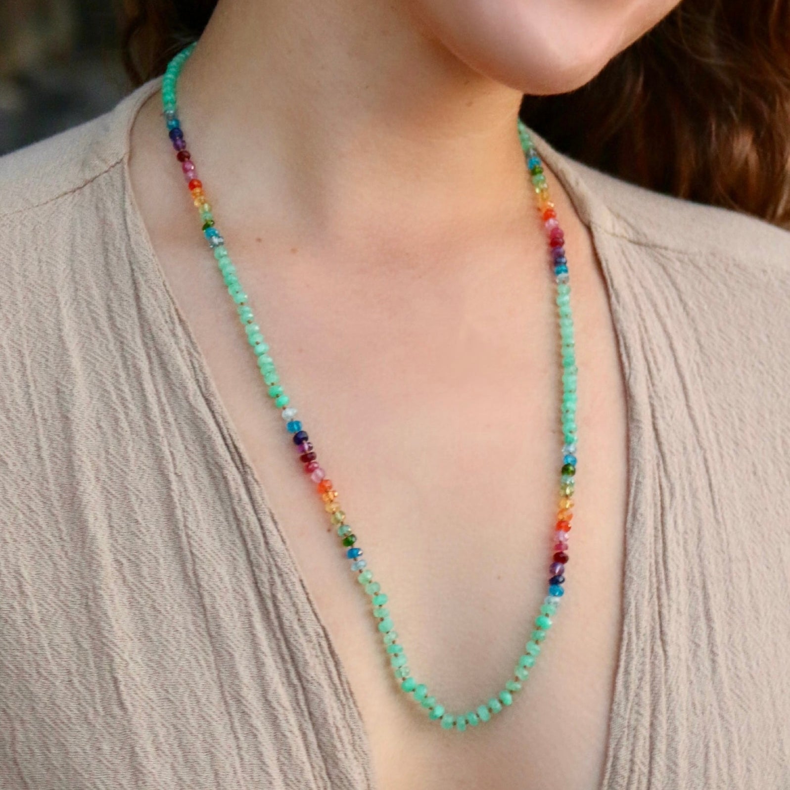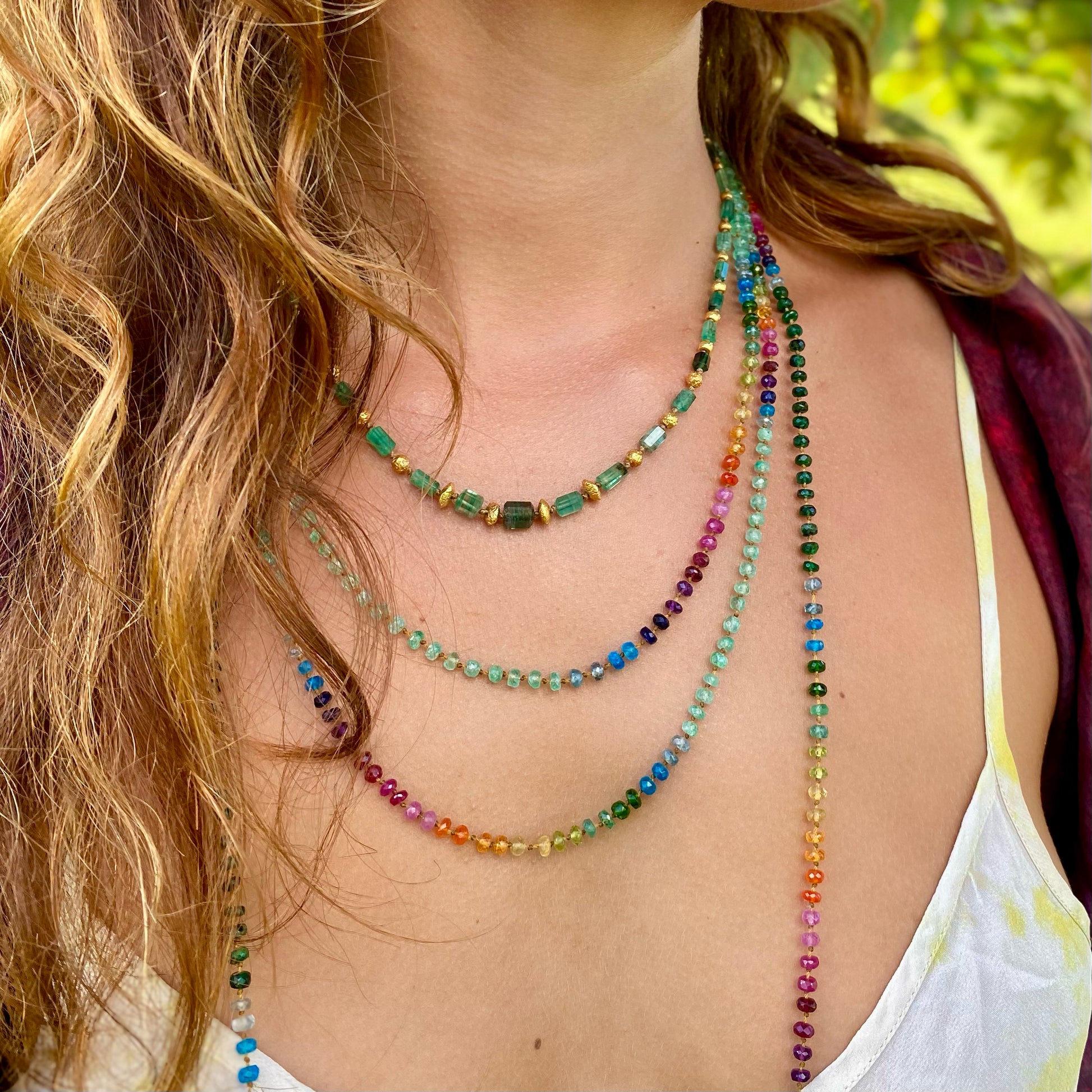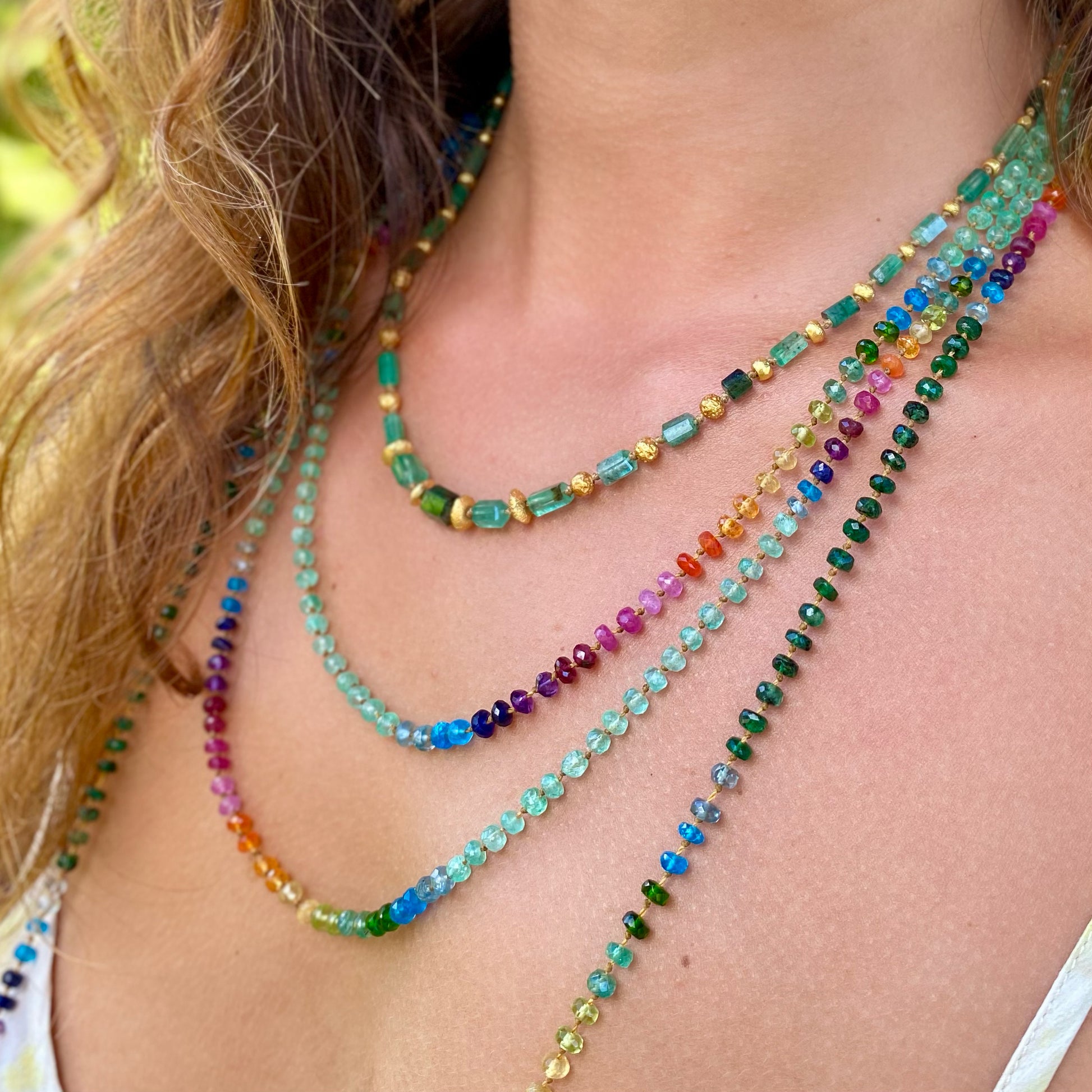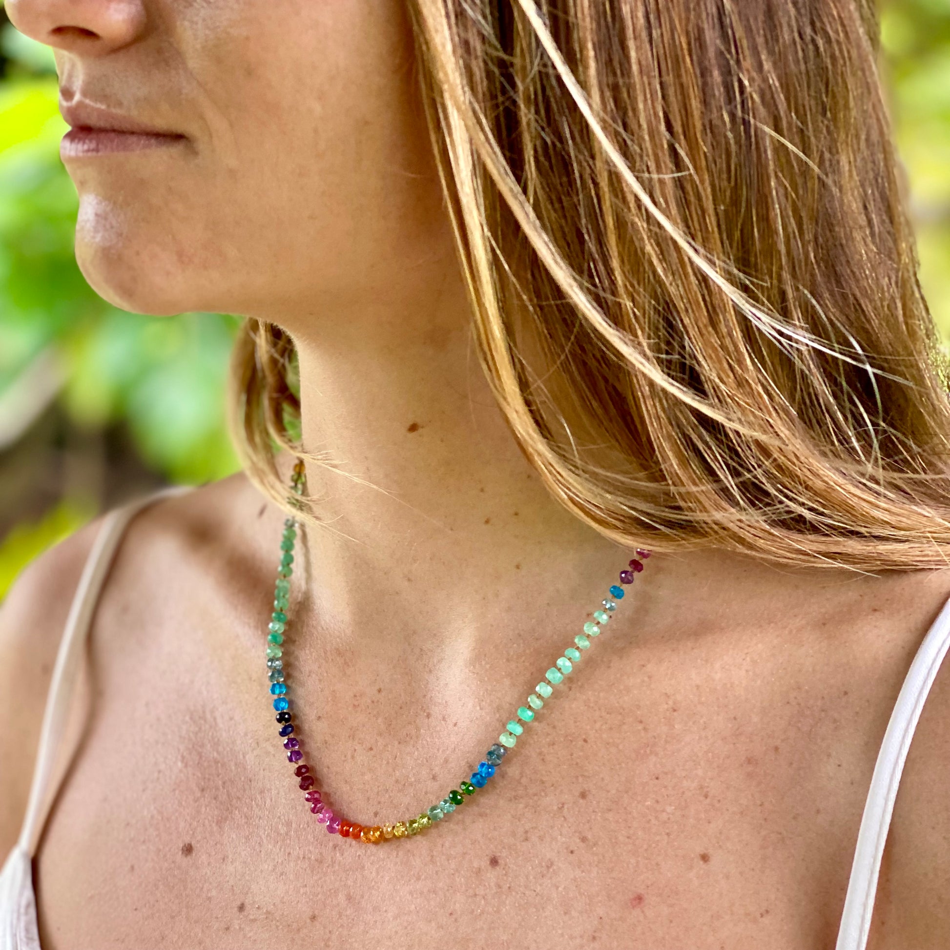 You can layer Rainbow Leis with with both our Alohi or Rainbow Drop collections. They are also a lovely compliment to our Rainbow Mana pieces and can be worn to bring forth dynamic color contrast or chosen mineral emphasis.