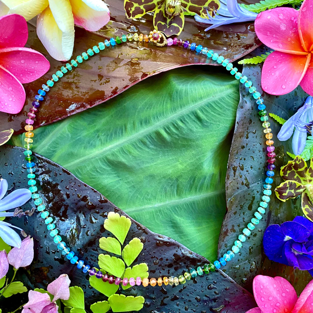 Leis are a quintessential expression of aloha and a stringed embrace of love, friendship, welcome, appreciation and honor. Rainbows are symbols of hope, new beginnings, equality for all beings, abundance, luck, and the bridge between human and spiritual worlds. Wearing this crystalline light spectrum is a bouquet of blessing, a welcoming of our embodied expression, and a powerful activation for new phases of life.