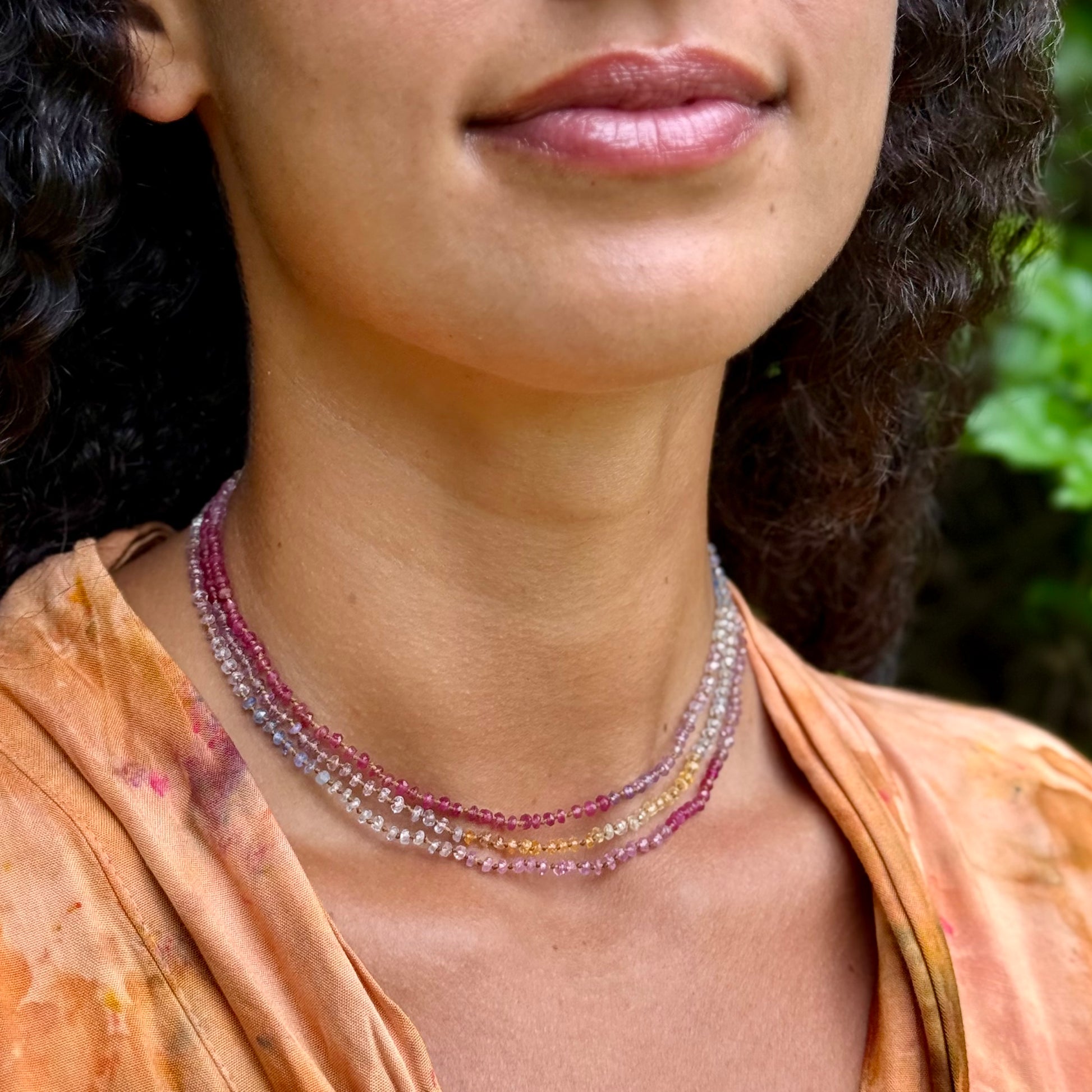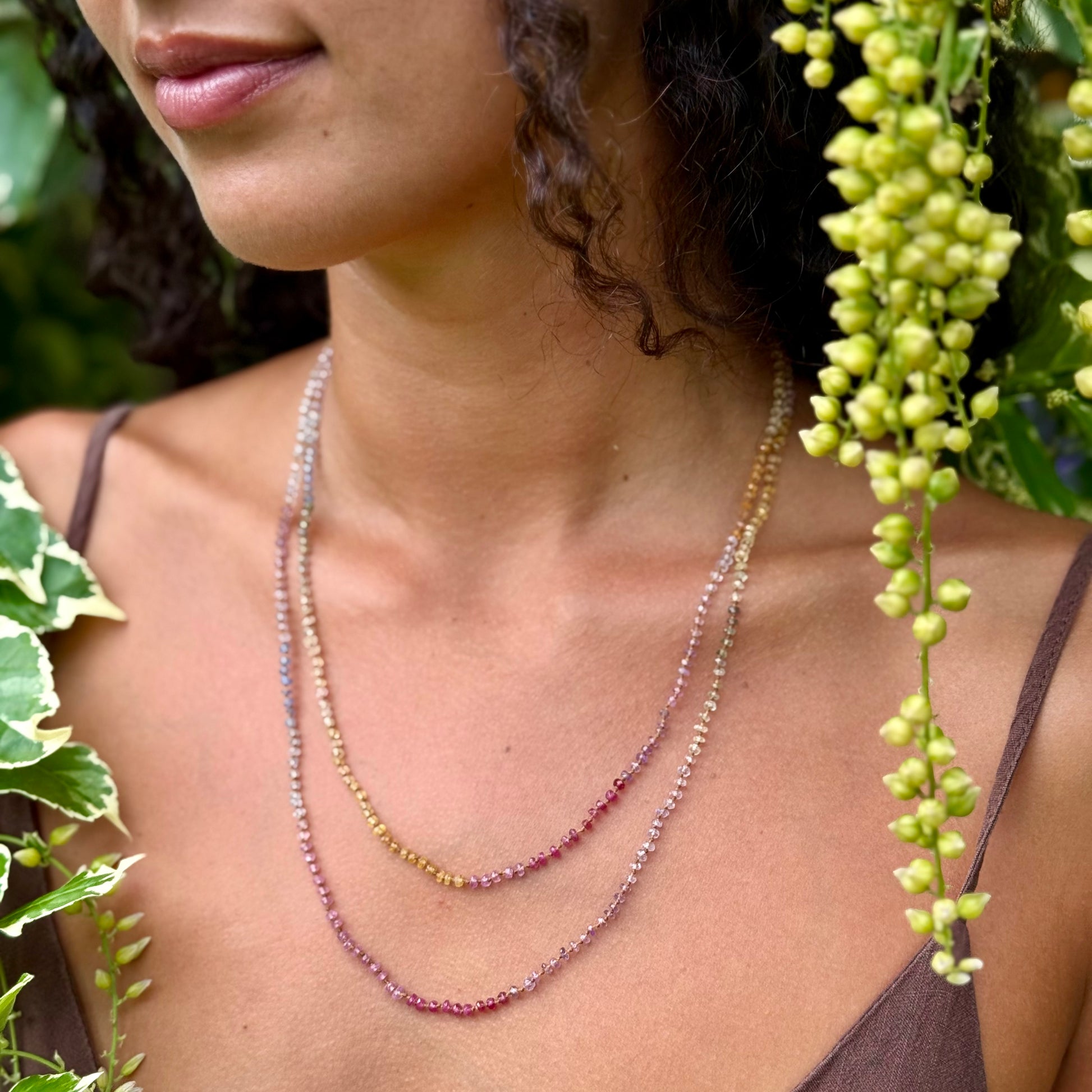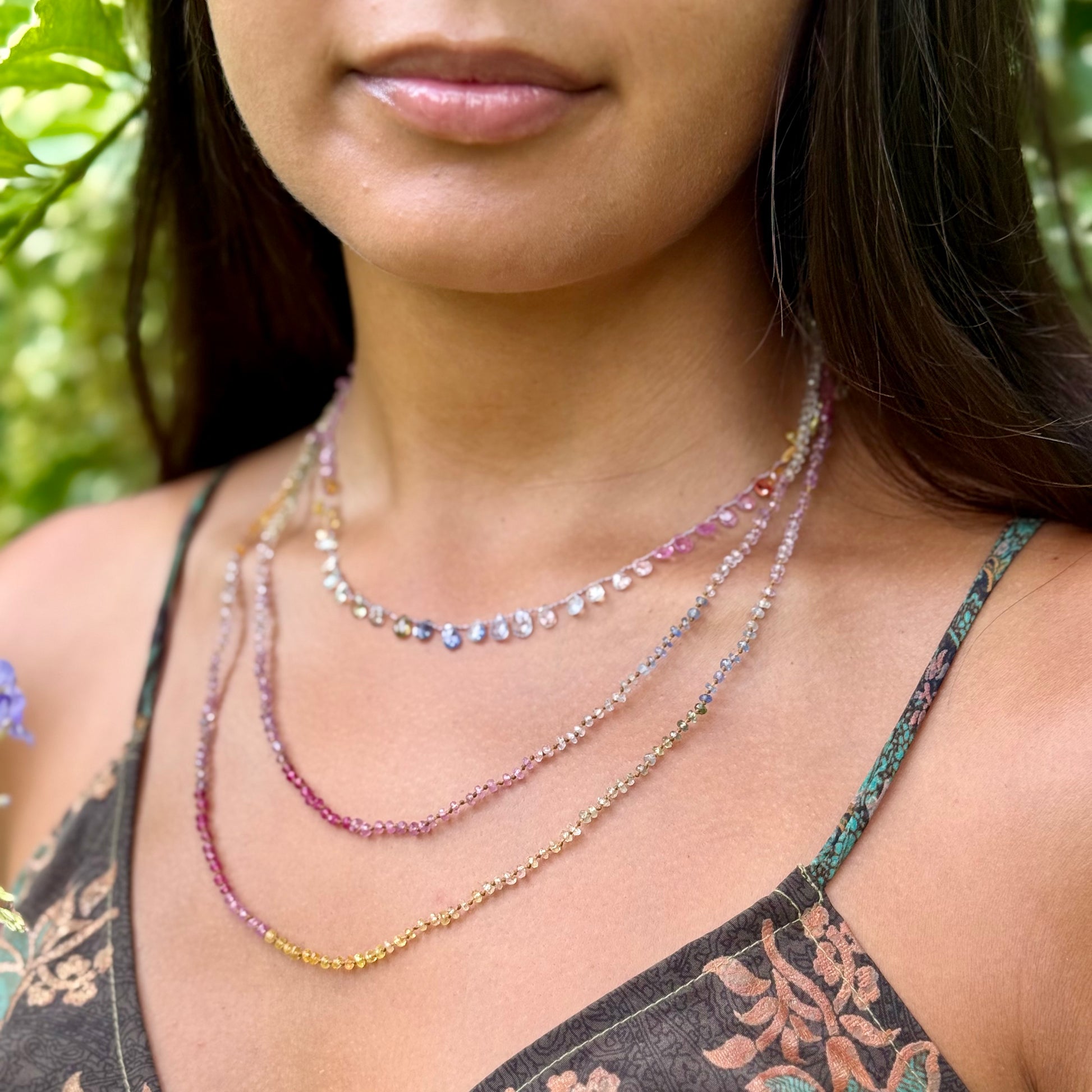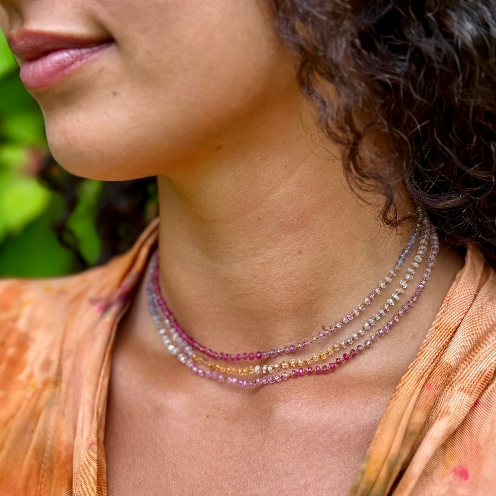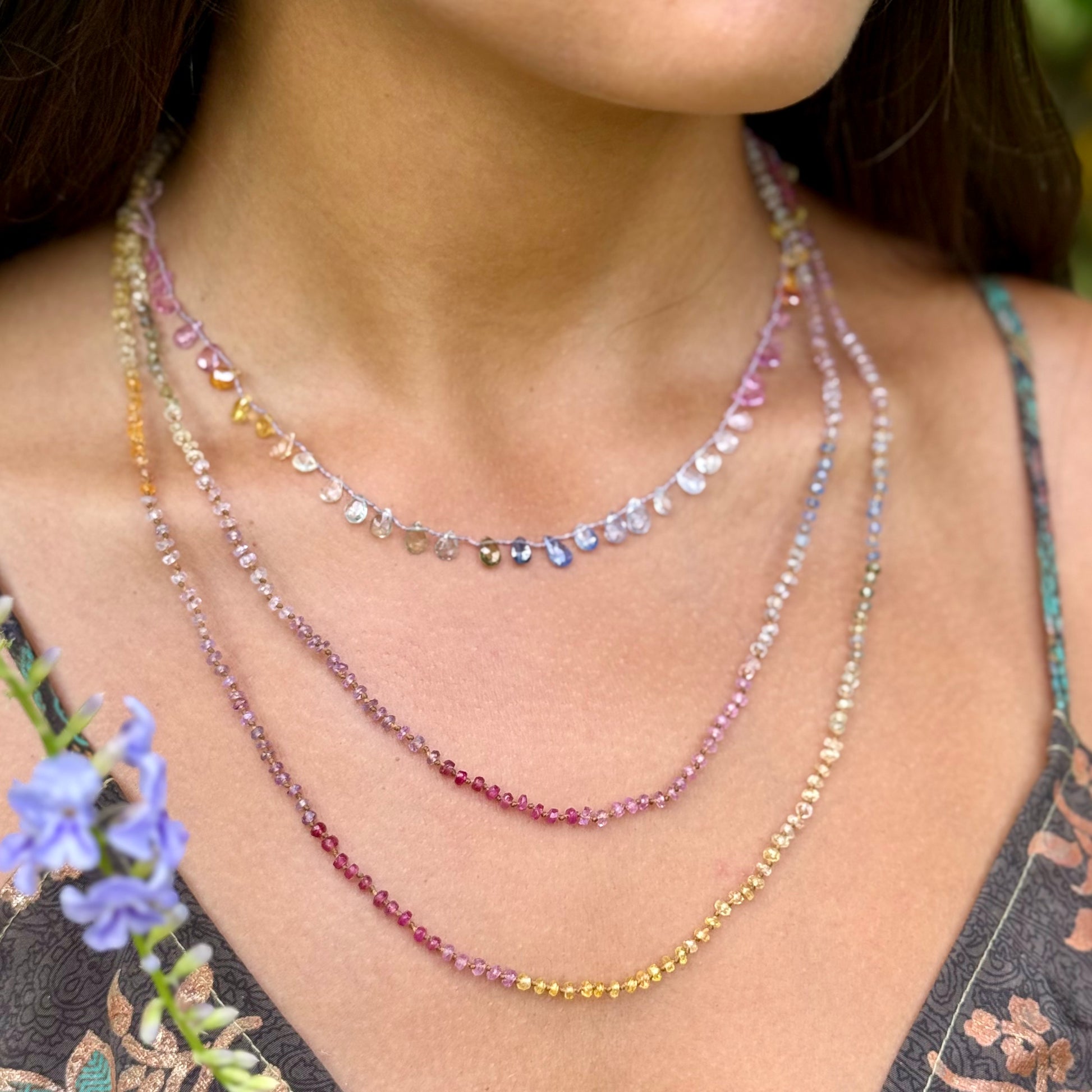Delicate, dreamy and divinely inspired. Beautifully colorful shades of Sapphires. Brighter than the Pastel Sapphires Lei. Softer than the Multi Sapphires Lei. Can be worn single or doubled around the neck, or as a wrap bracelet.