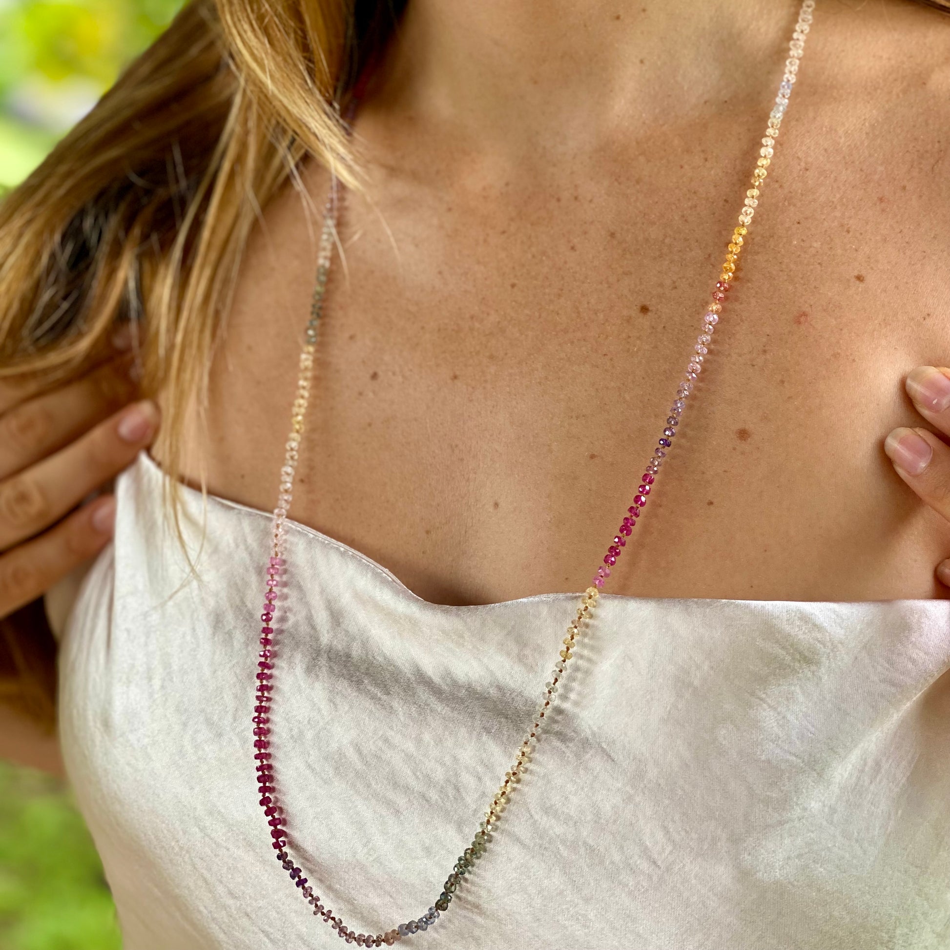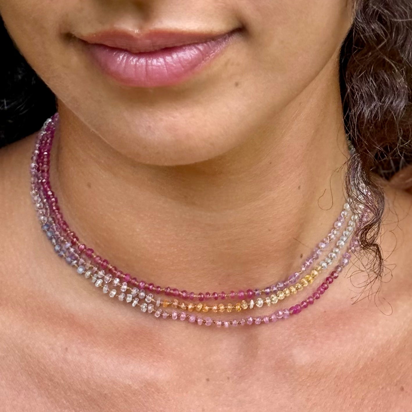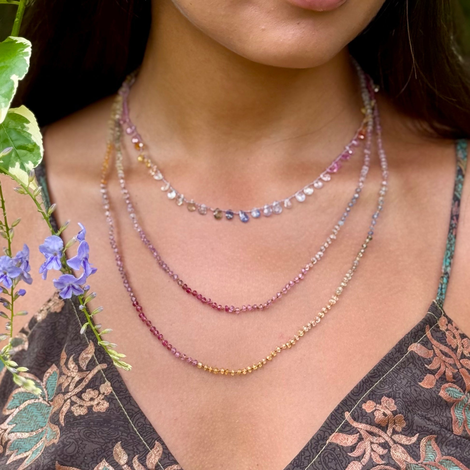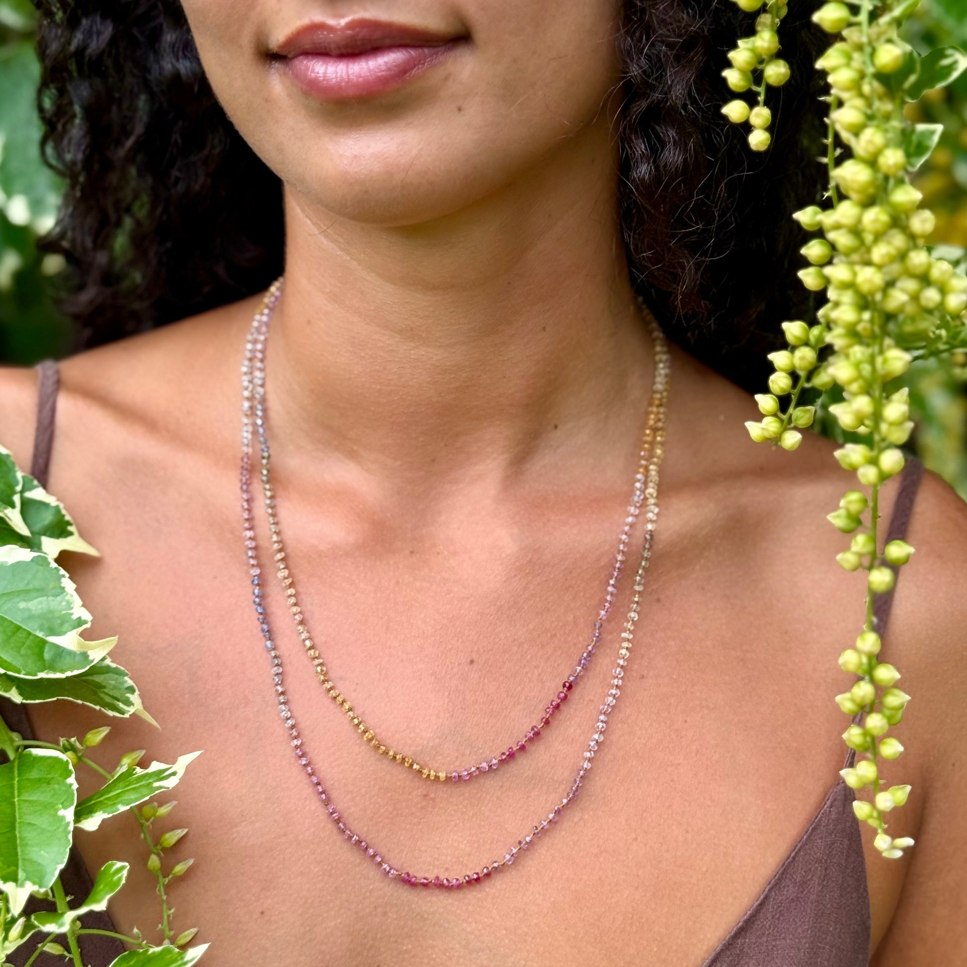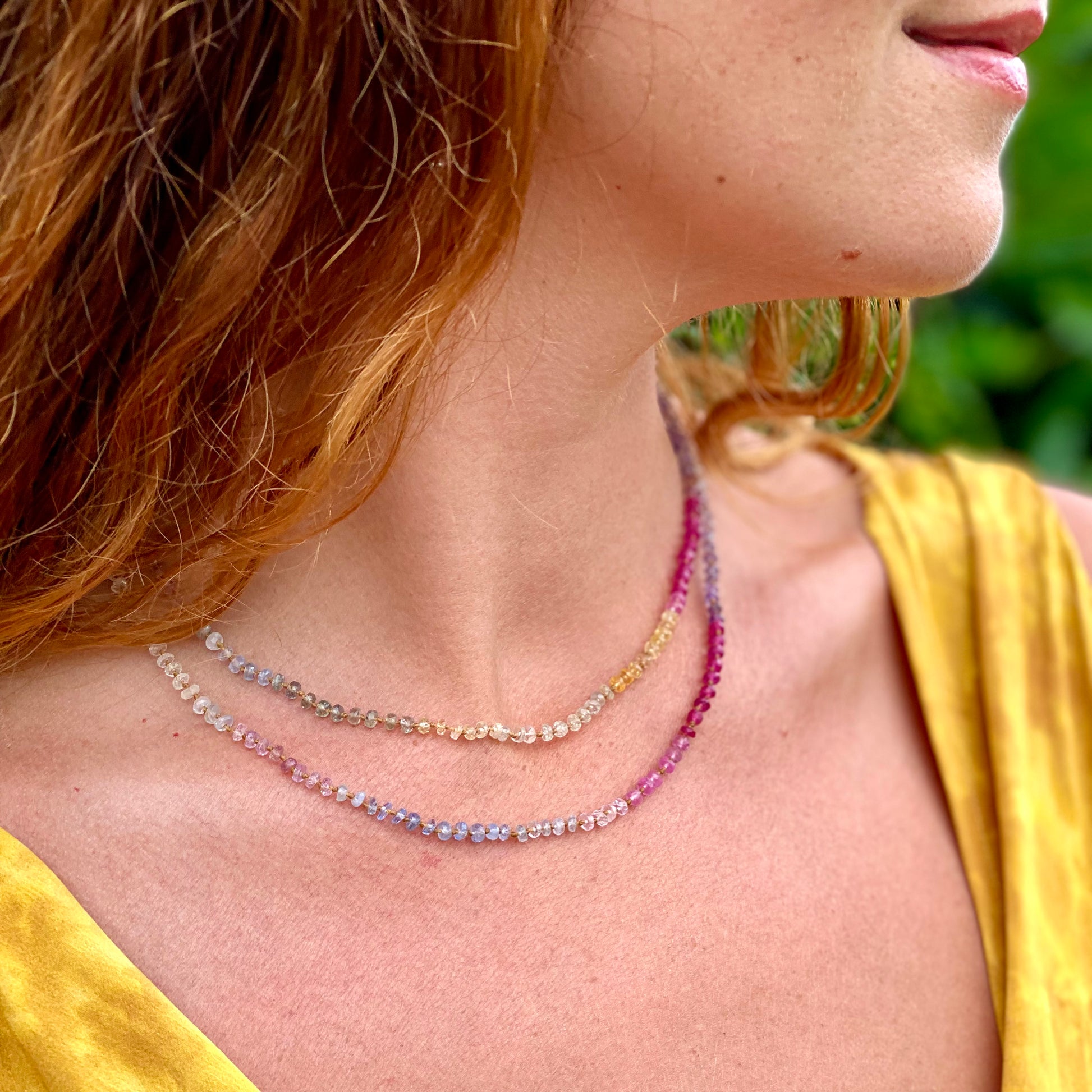 Delicate, dreamy and divinely inspired. Beautifully colorful shades of Sapphires. Brighter than the Pastel Sapphires Lei. Softer than the Multi Sapphires Lei. Can be worn single or doubled around the neck, or as a wrap bracelet.