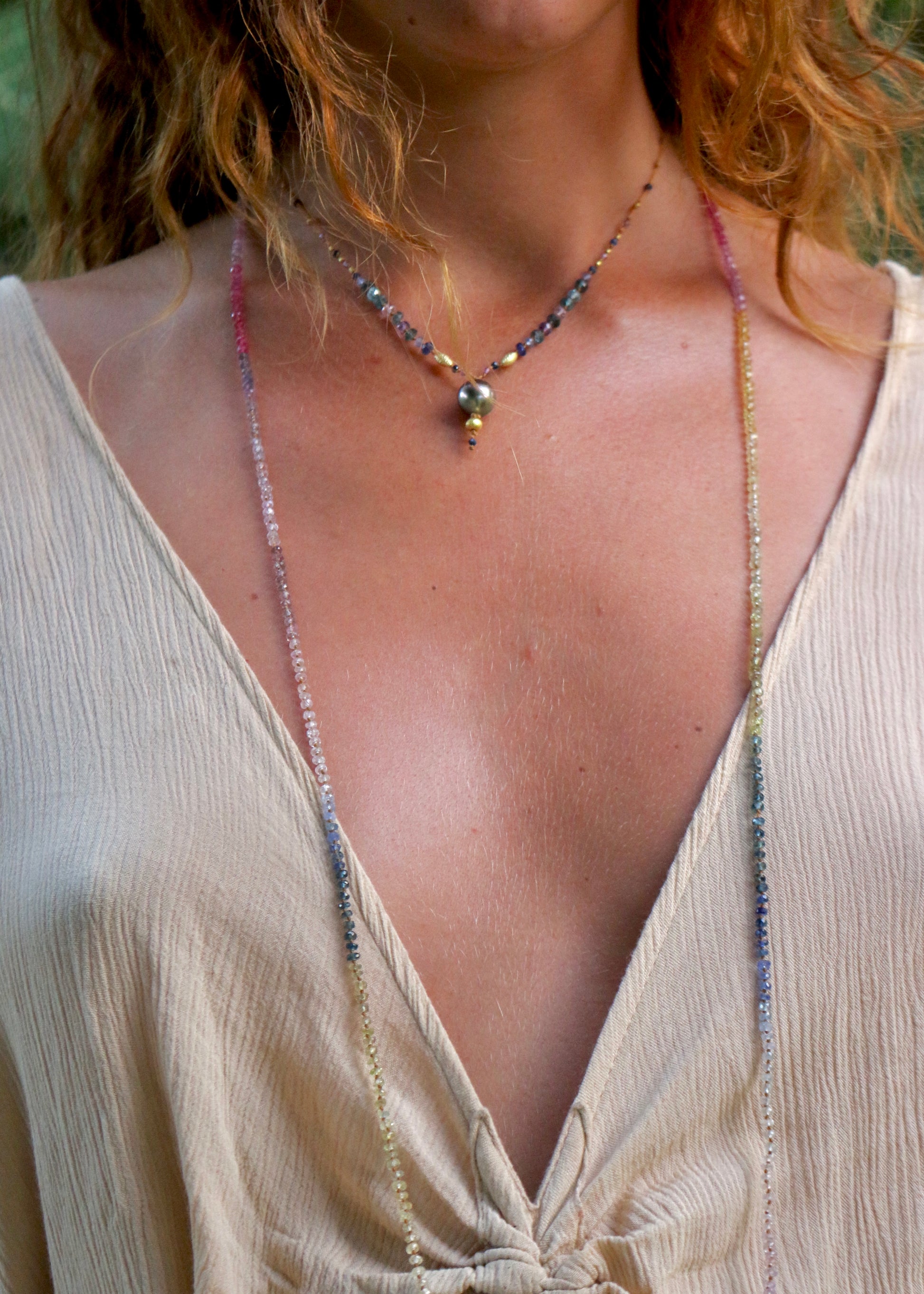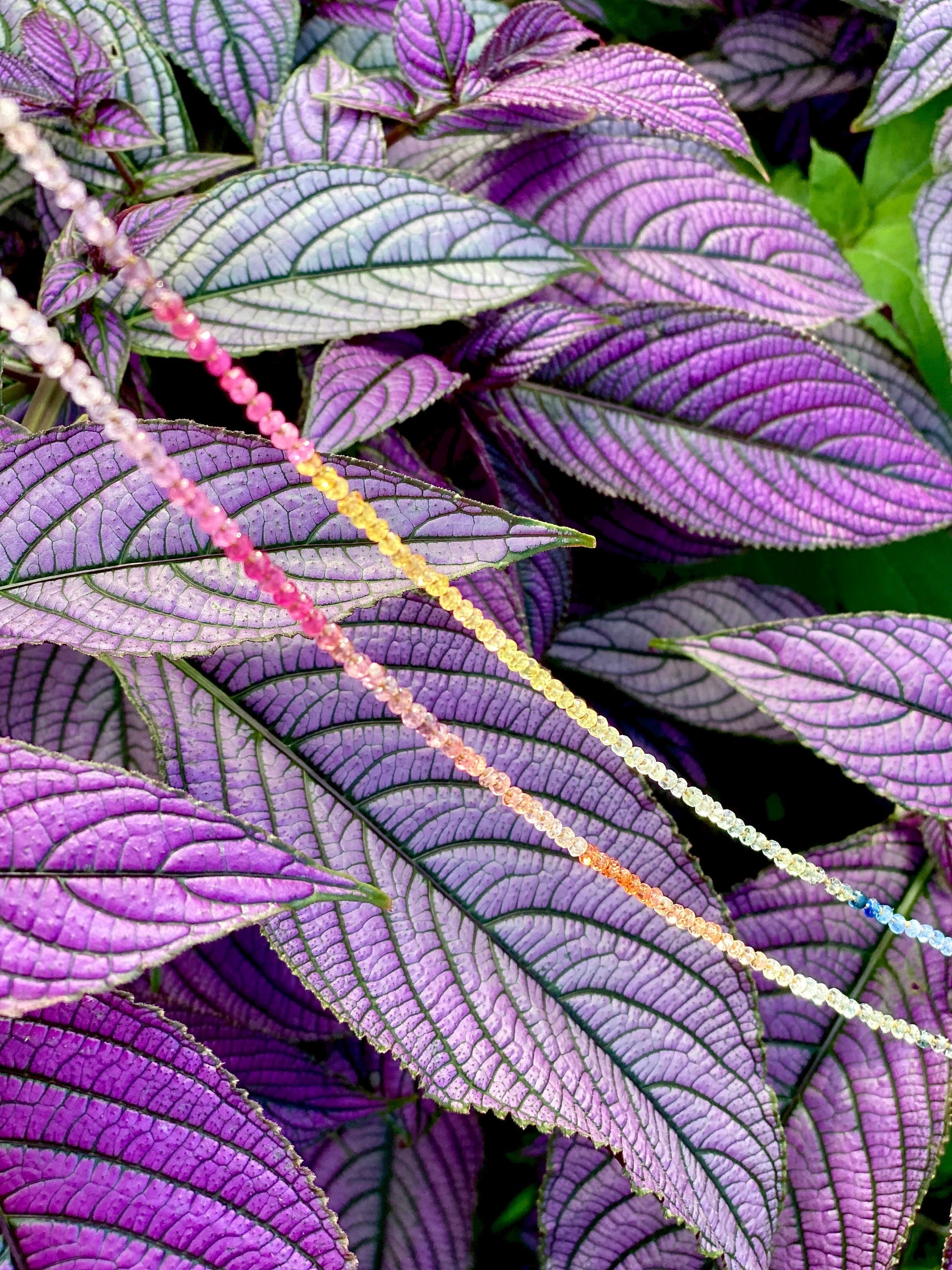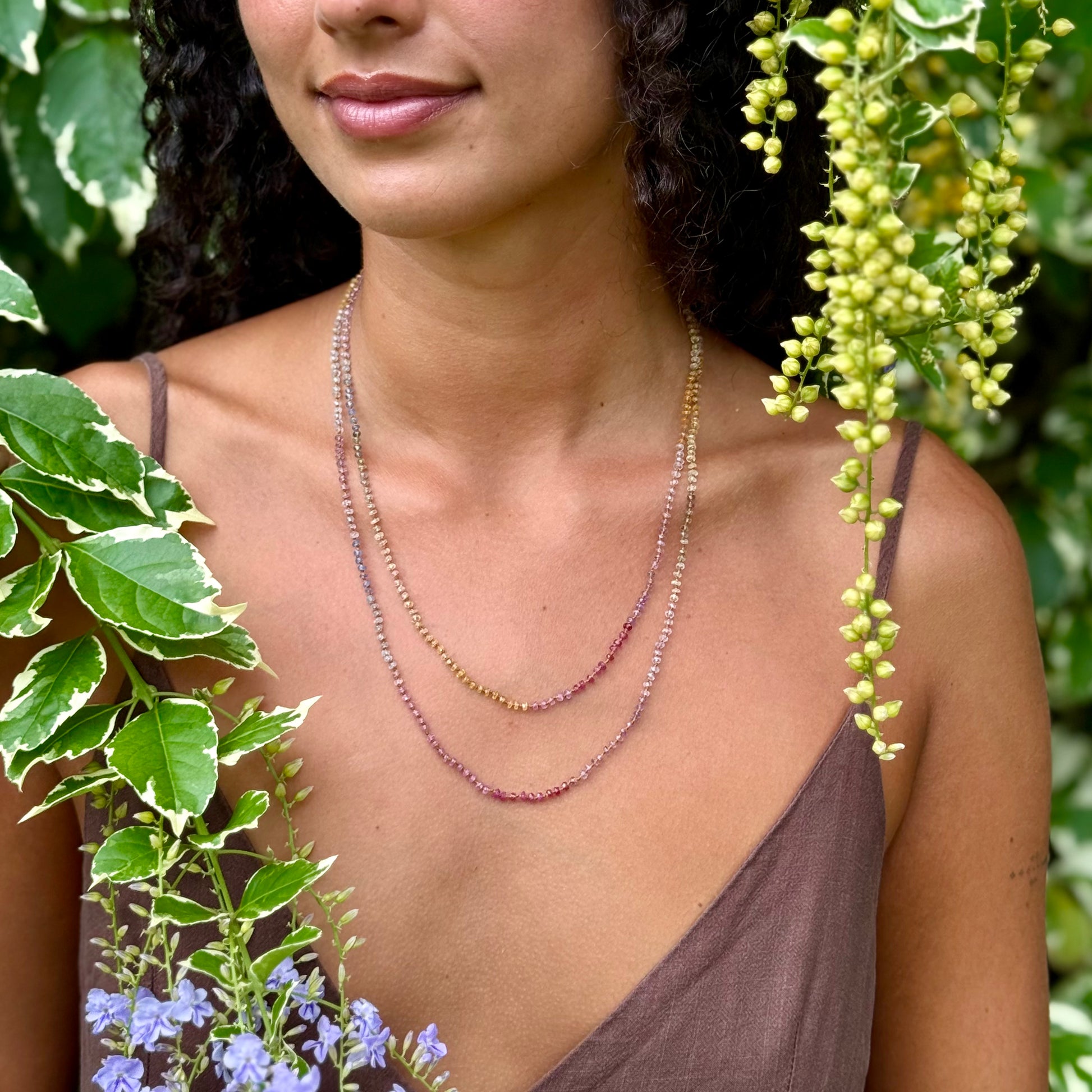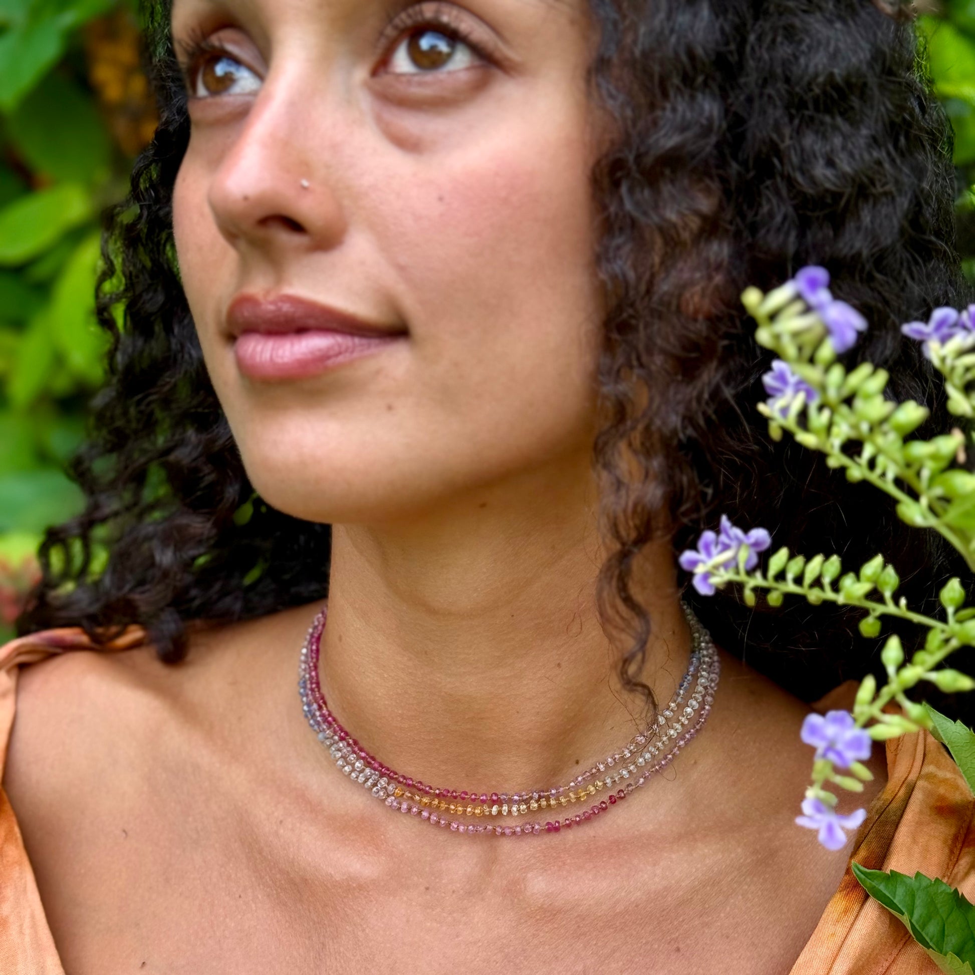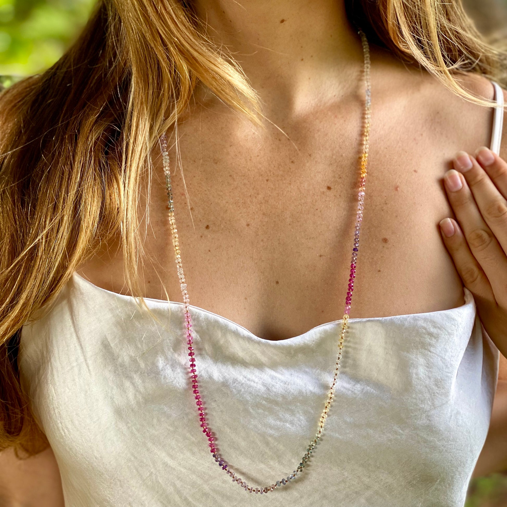 Delicate, dreamy and divinely inspired. Beautifully colorful shades of Sapphires. Brighter than the Pastel Sapphires Lei. Softer than the Multi Sapphires Lei. Can be worn single or doubled around the neck, or as a wrap bracelet.