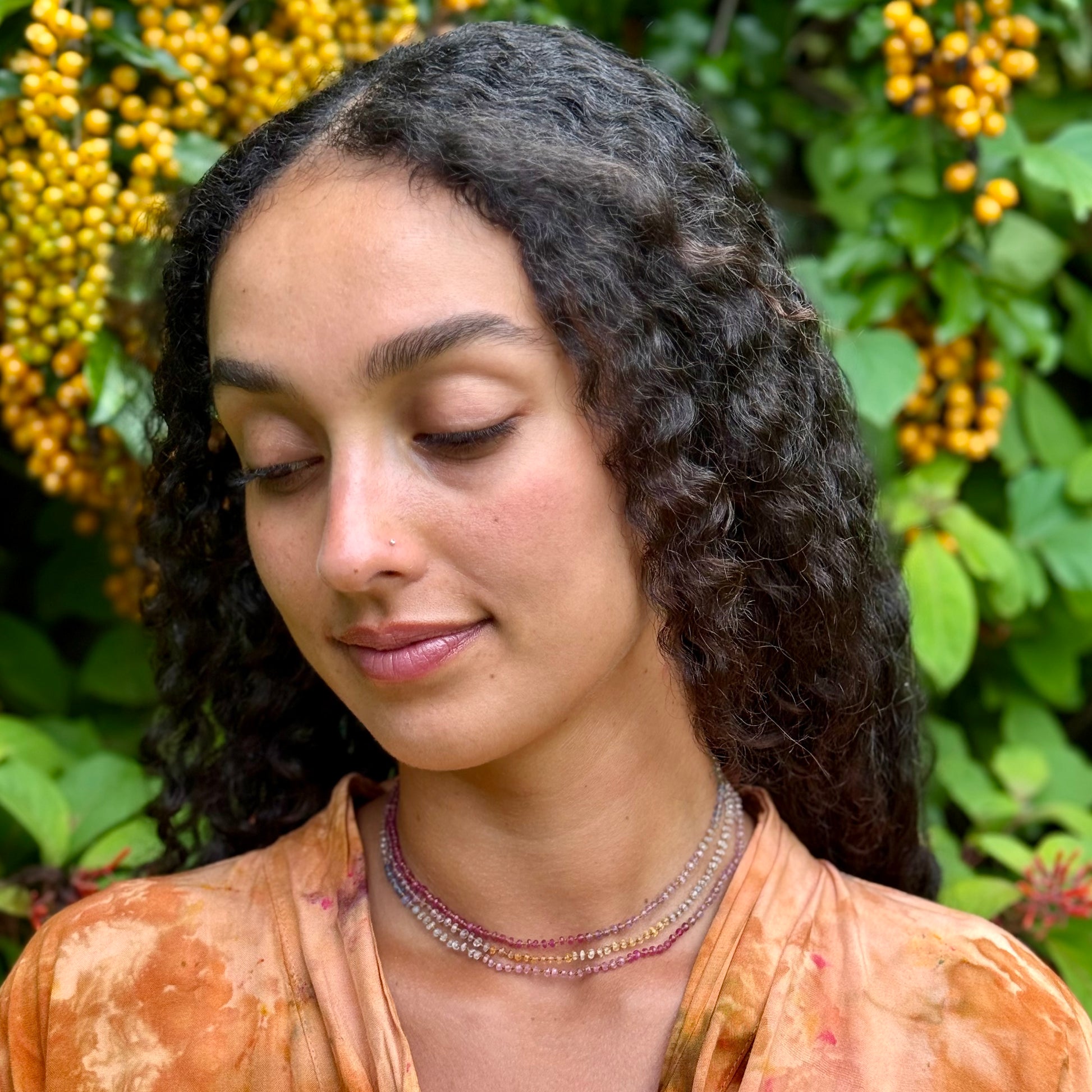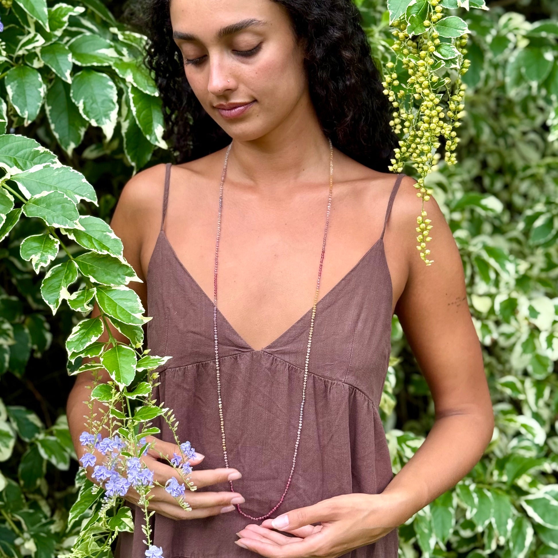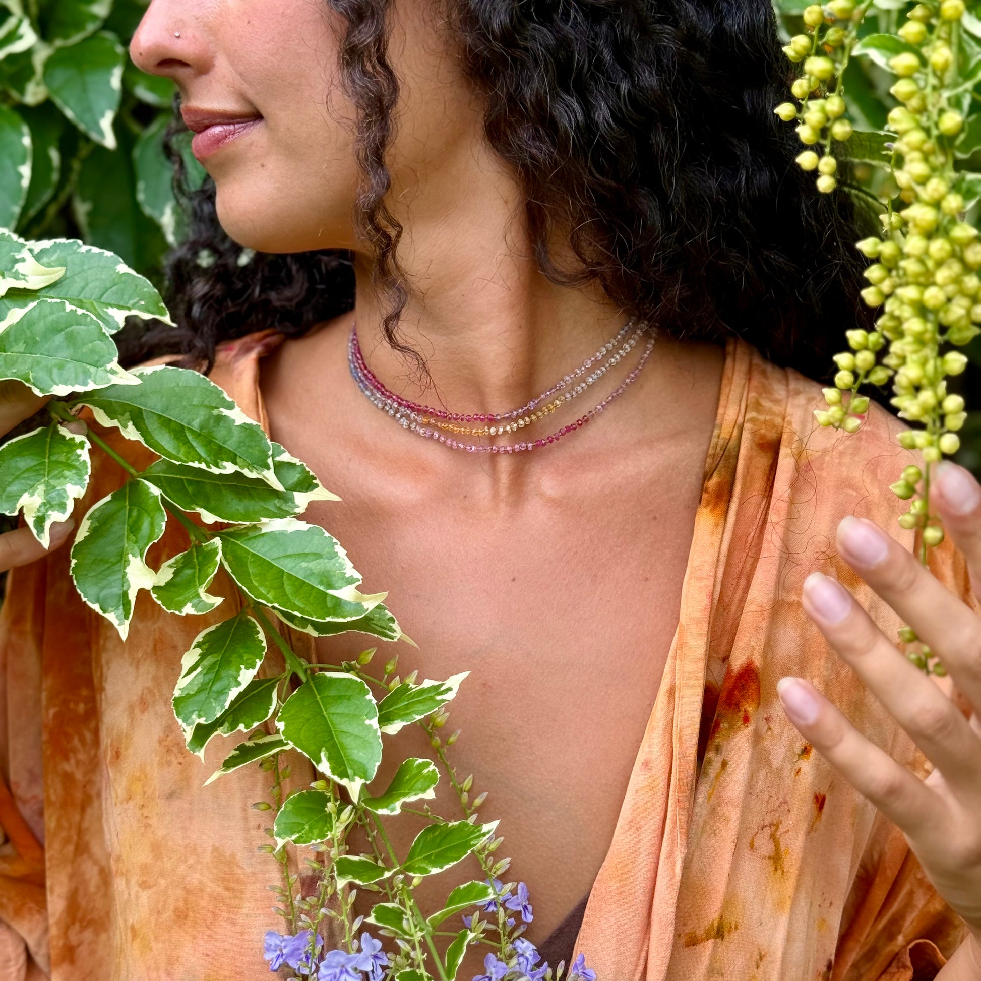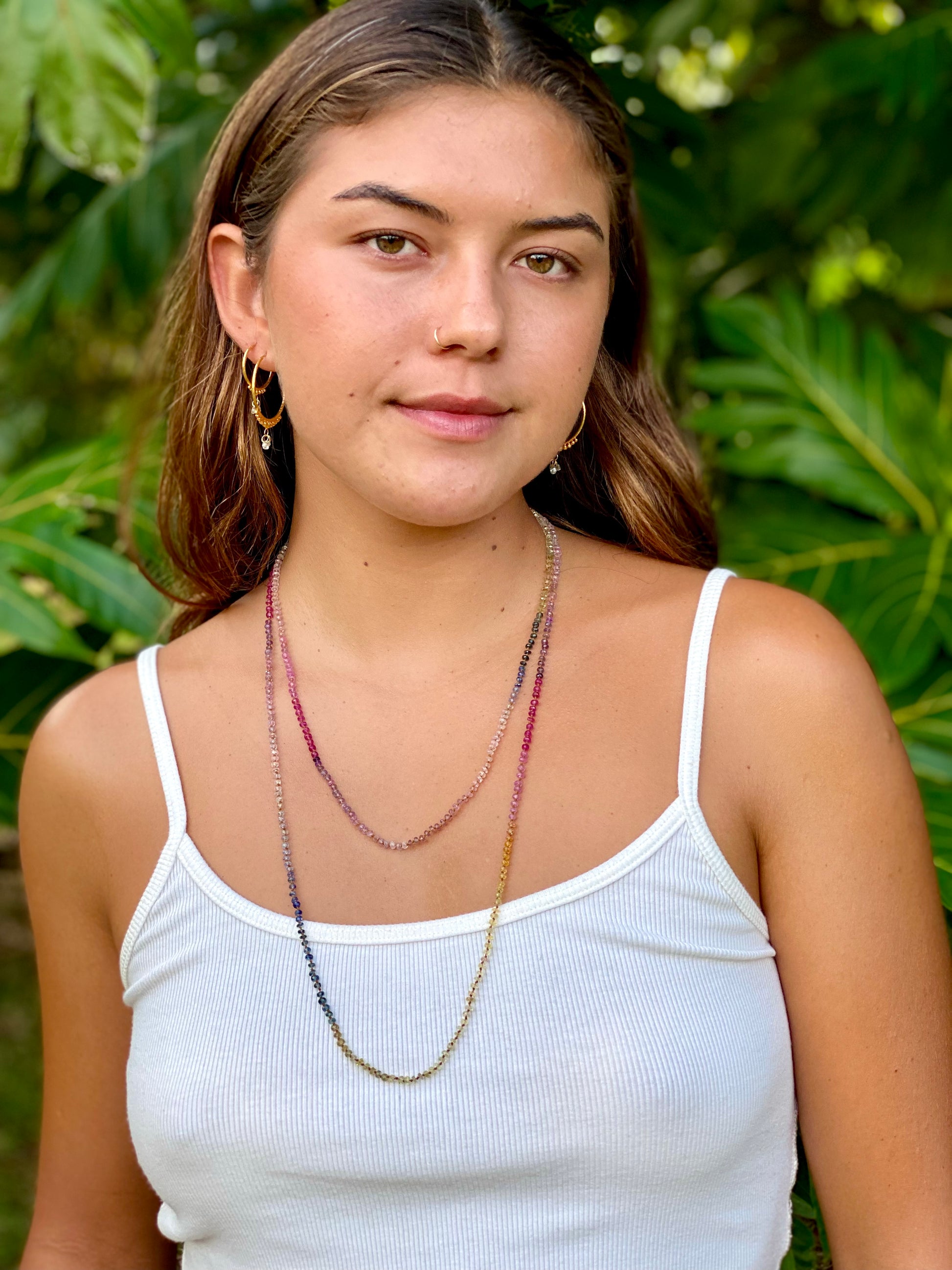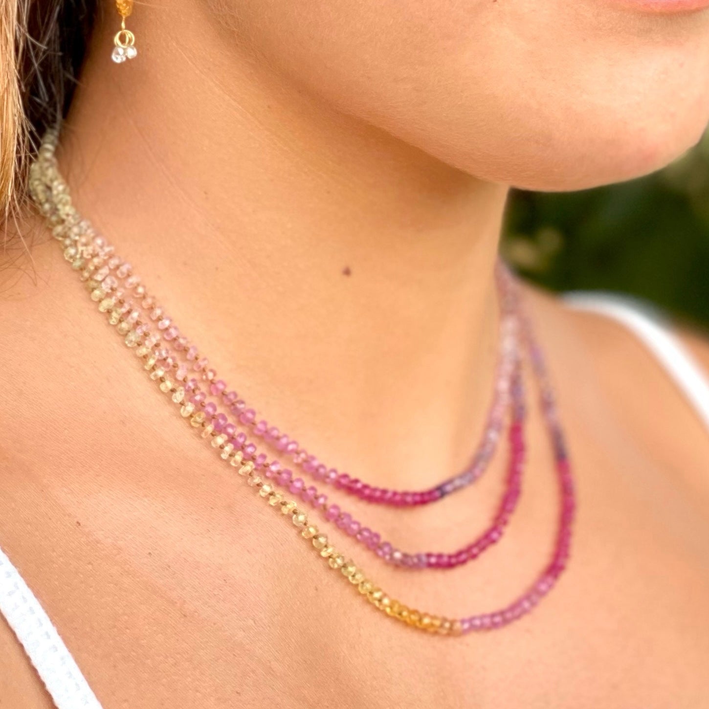 Delicate, dreamy and divinely inspired. Beautifully colorful shades of Sapphires. Brighter than the Pastel Sapphires Lei. Softer than the Multi Sapphires Lei. Can be worn single or doubled around the neck, or as a wrap bracelet.