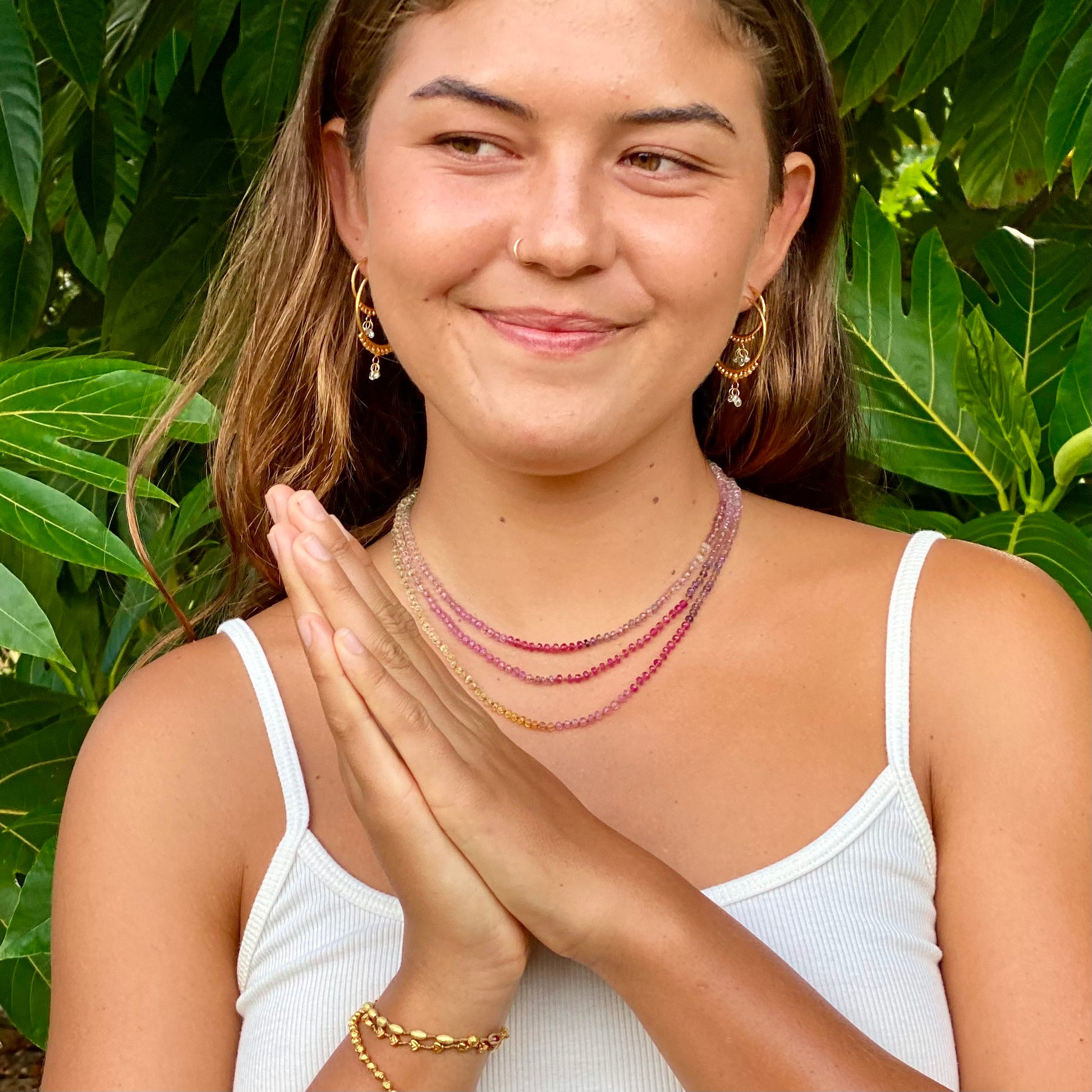 Our pastel sapphires layer beautifully with other pastel sapphires in the LANI collection. Additionally they stack well with diamonds in our HOKU collection or with other pastel pieces from our ALOHI, MALA, AND LEI collections. We particularly enjoy their delicate colors aside the tiny pearl or golden zircon lei.