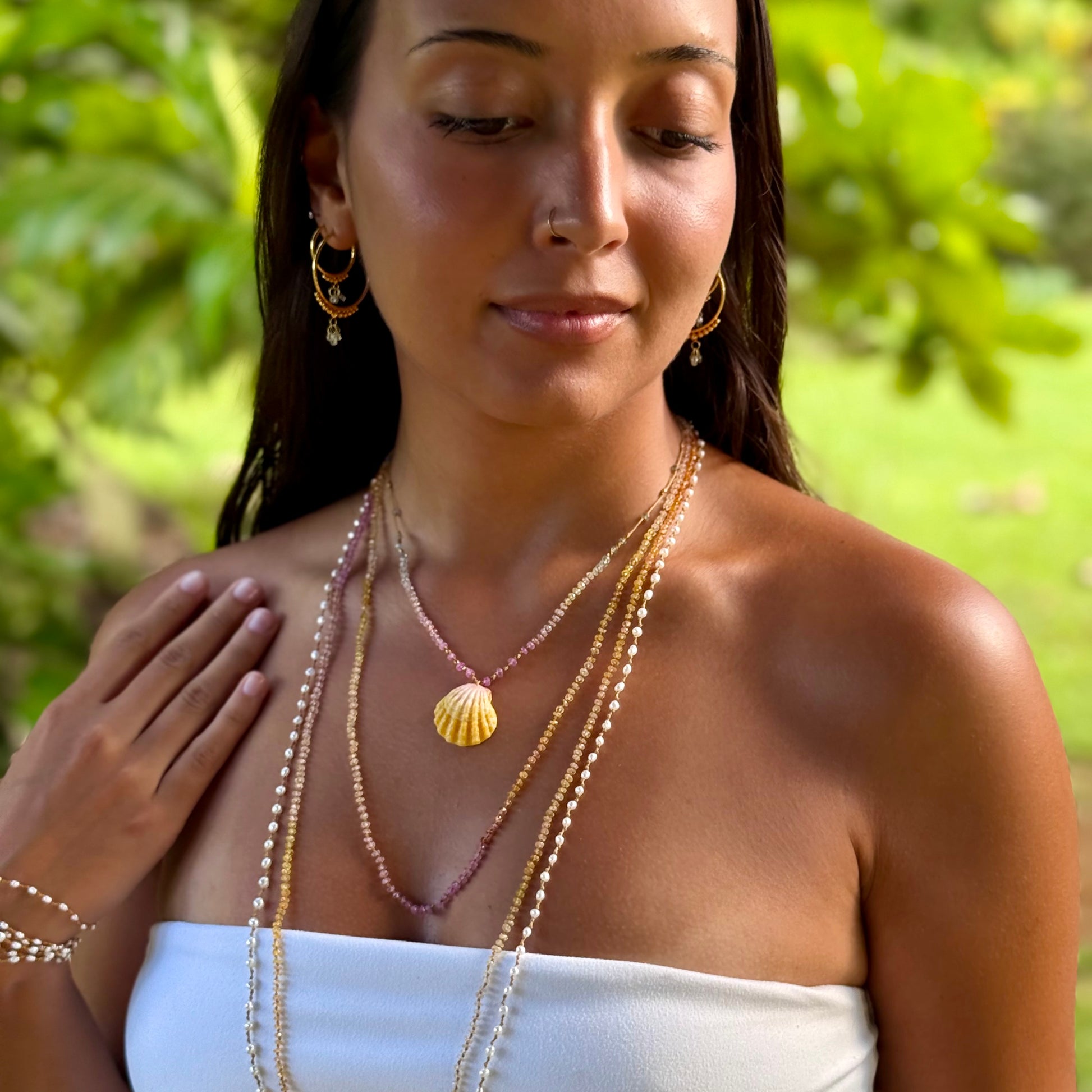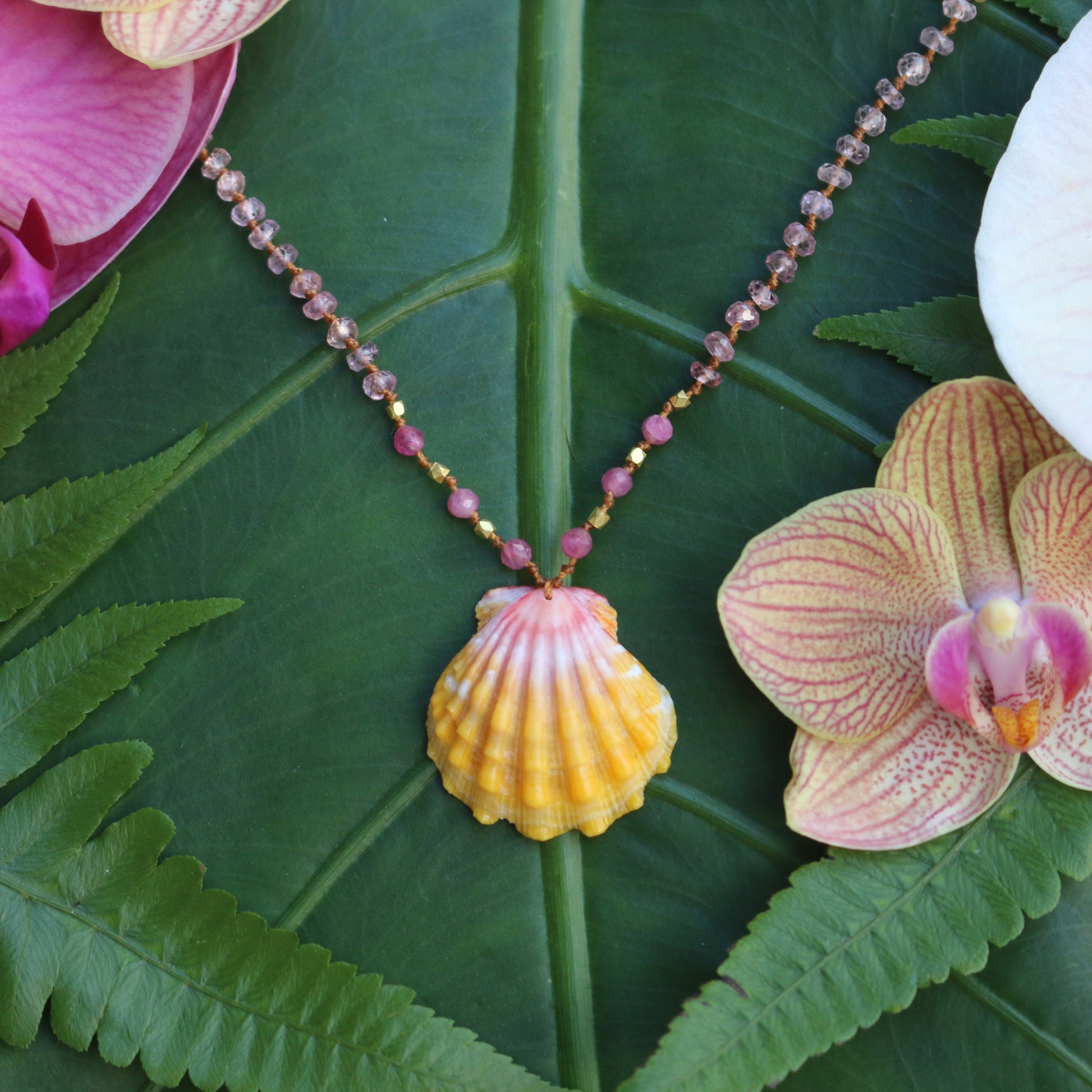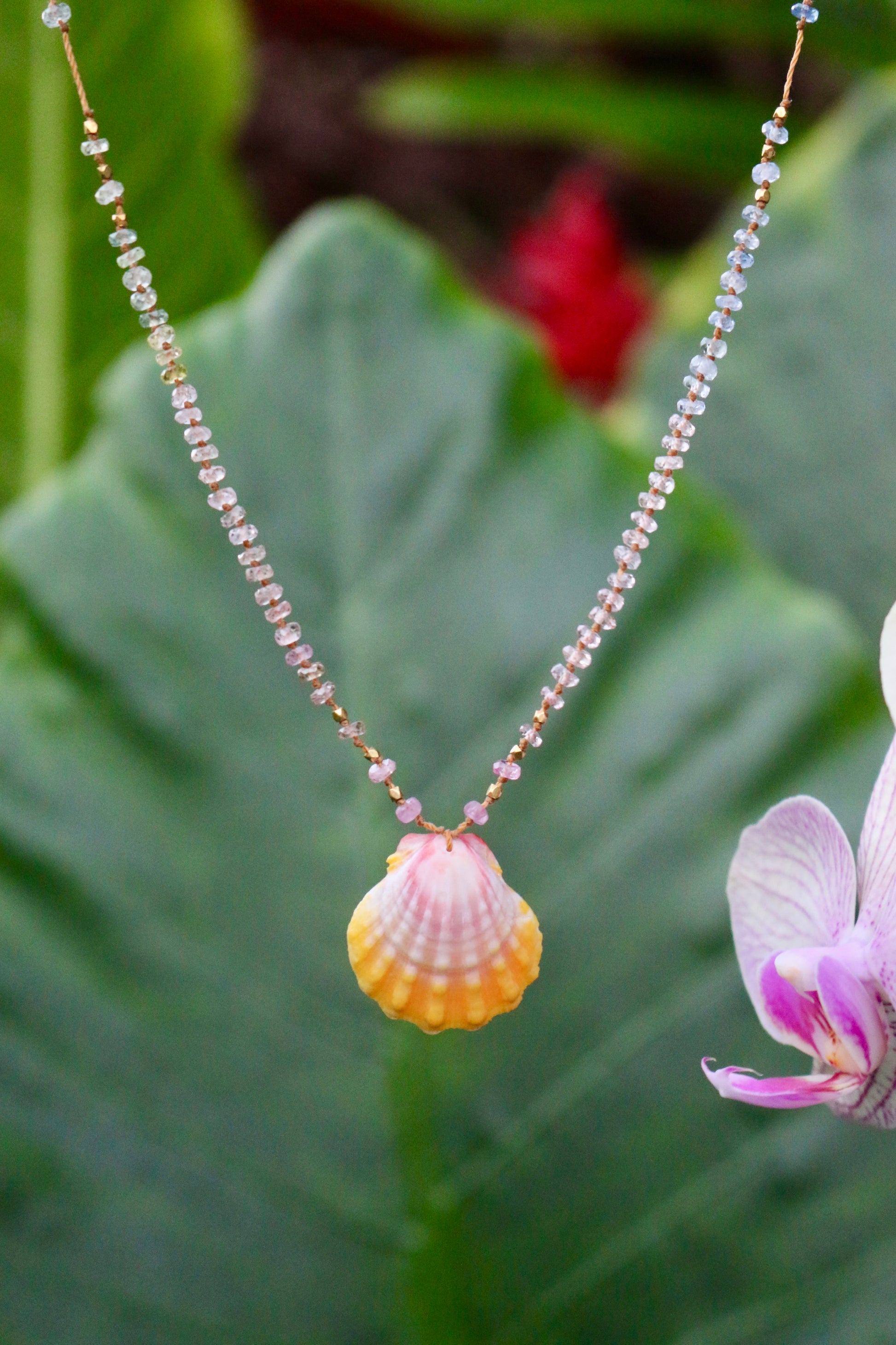 Part of our divinely inspired Pastel Sapphire collection this Aloha piece features a beloved Hawaiian Sunrise Shell with a pastel gradation of Sapphires and handmade solid 18k gold beads.