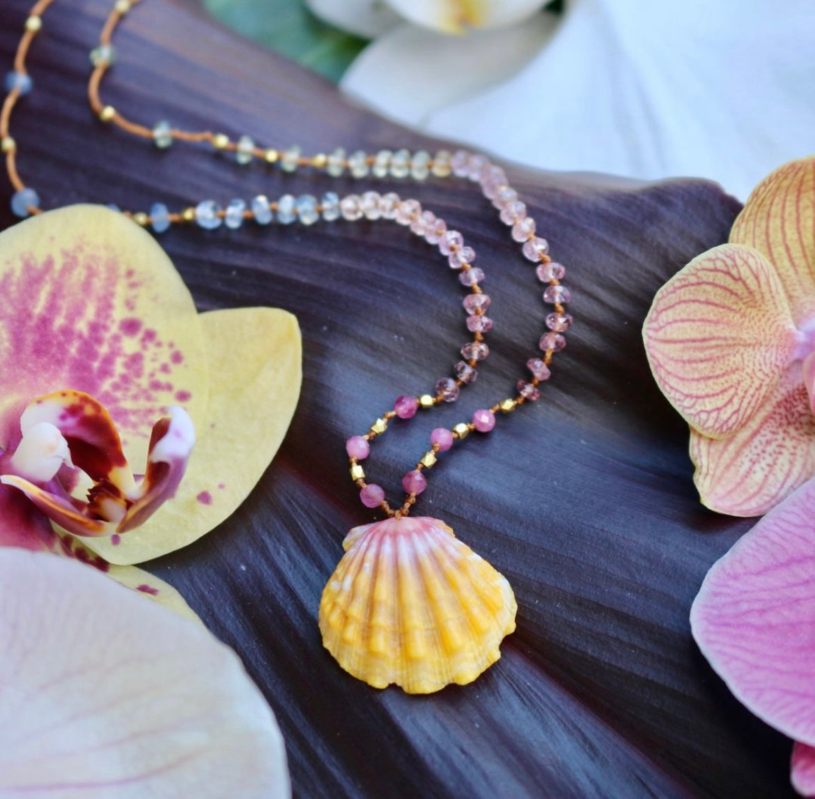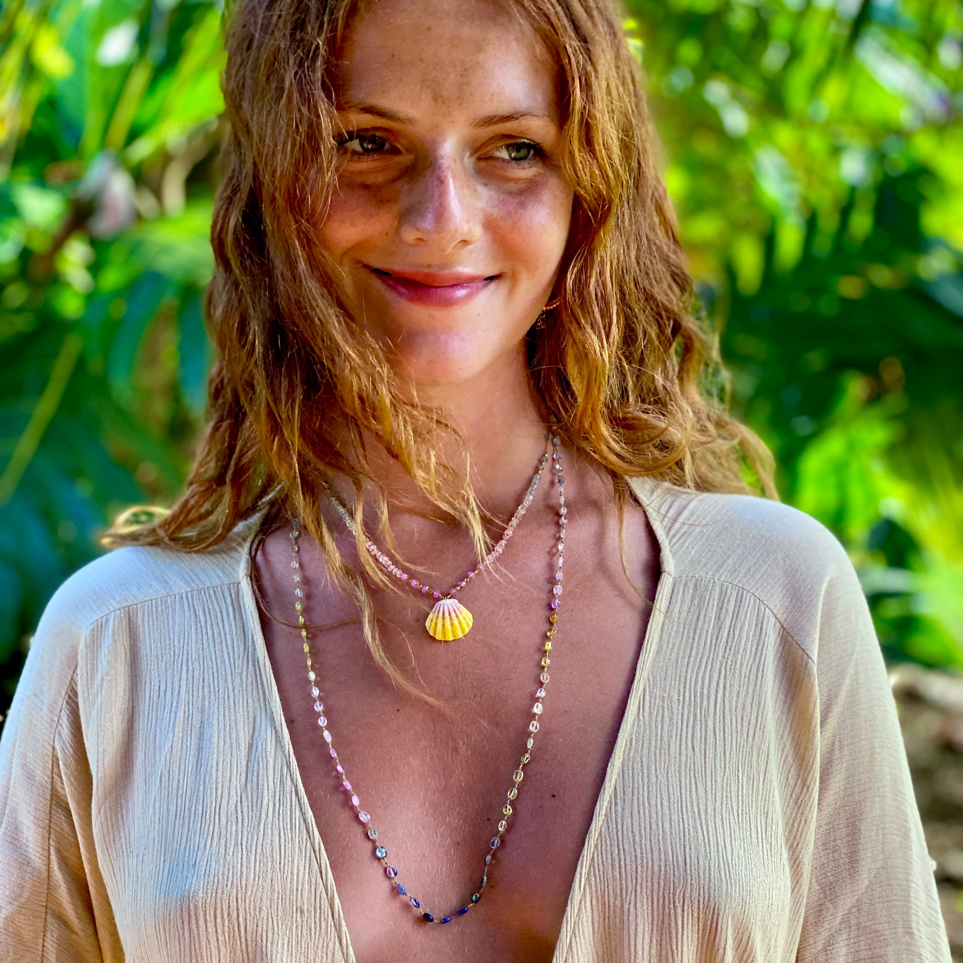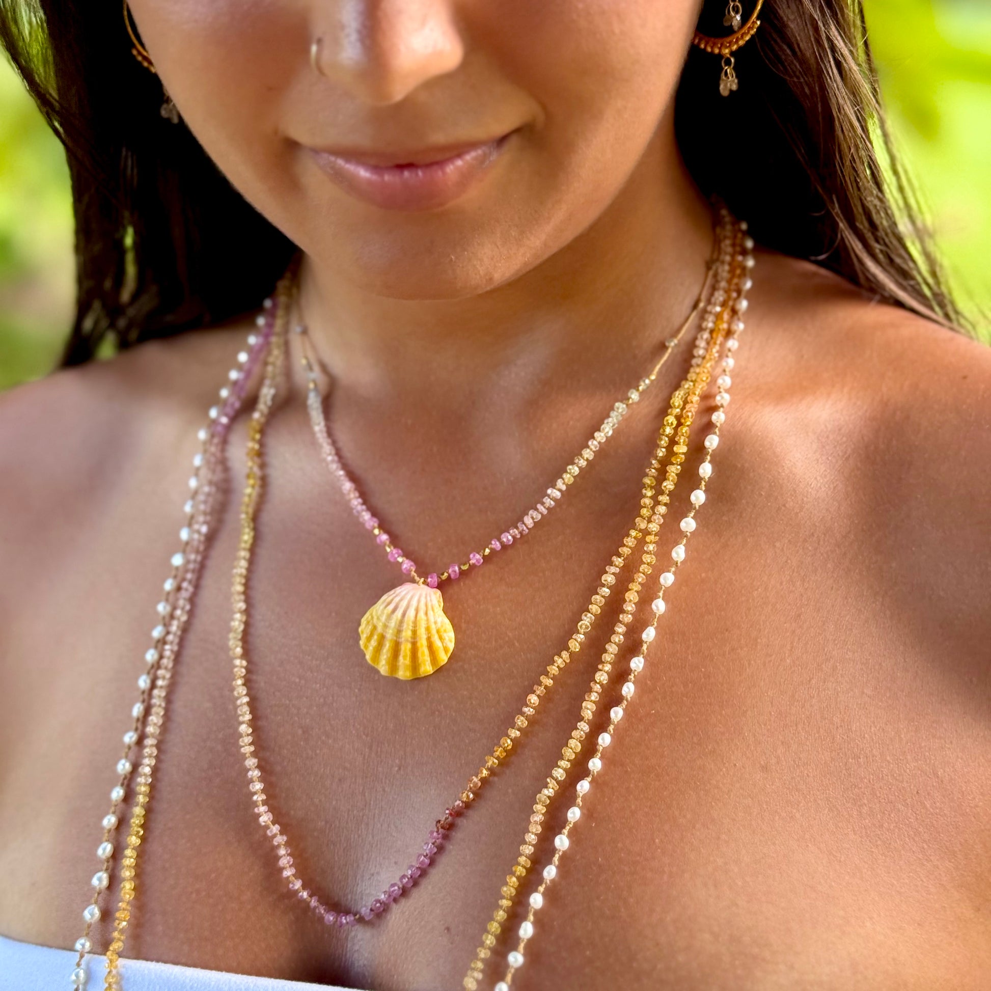Part of our divinely inspired Pastel Sapphire collection this Aloha piece features a beloved Hawaiian Sunrise Shell with a pastel gradation of Sapphires and handmade solid 18k gold beads.