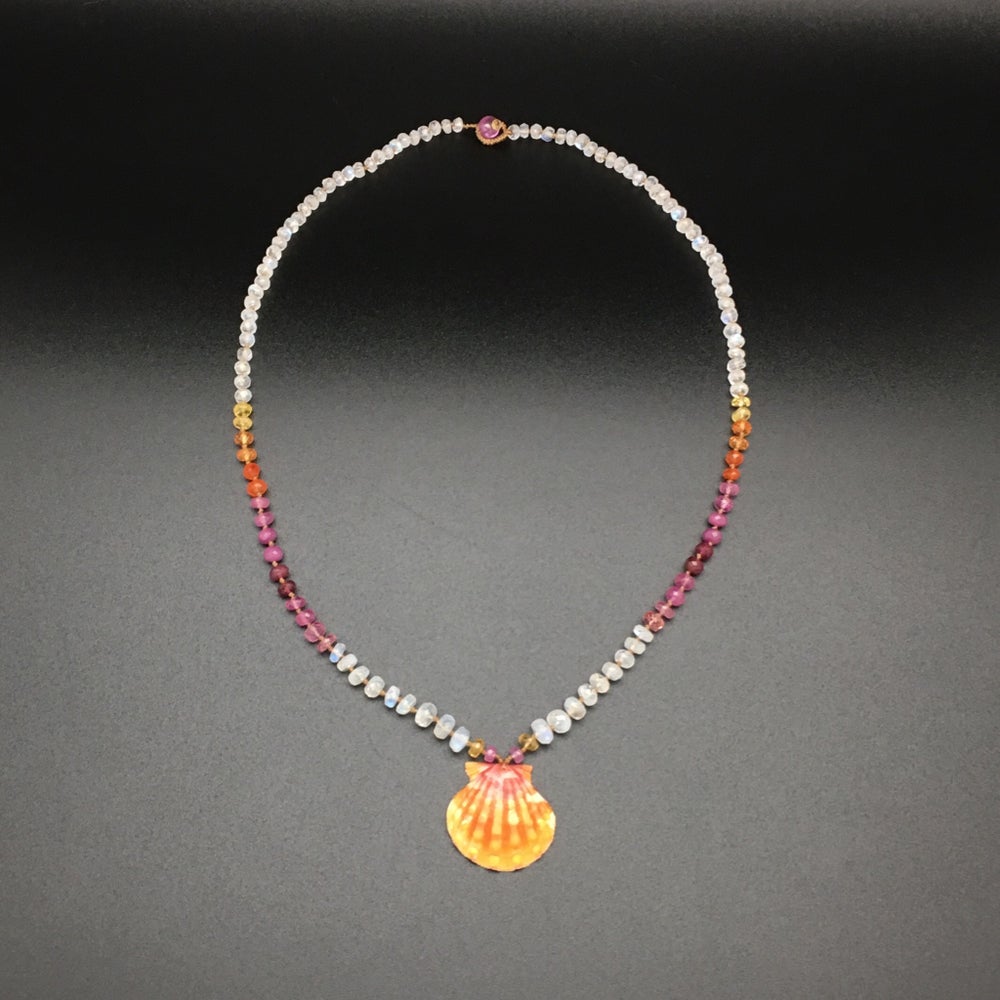 Saturated in the rainbow prism, this power piece features a beloved Hawaiian Sunrise Shell held in prismatic Moonstones and a vitality inspiring sequence of warm gemstones.