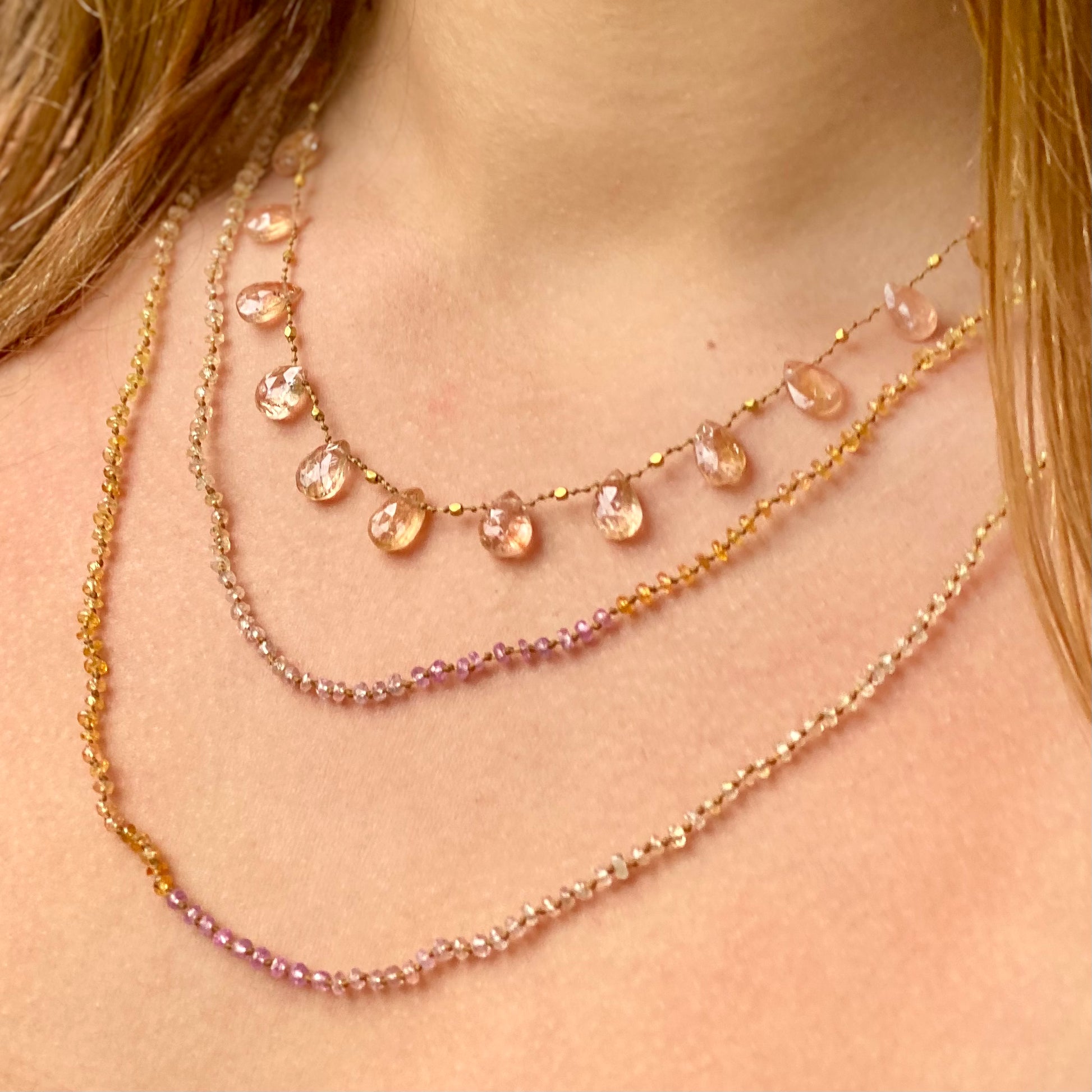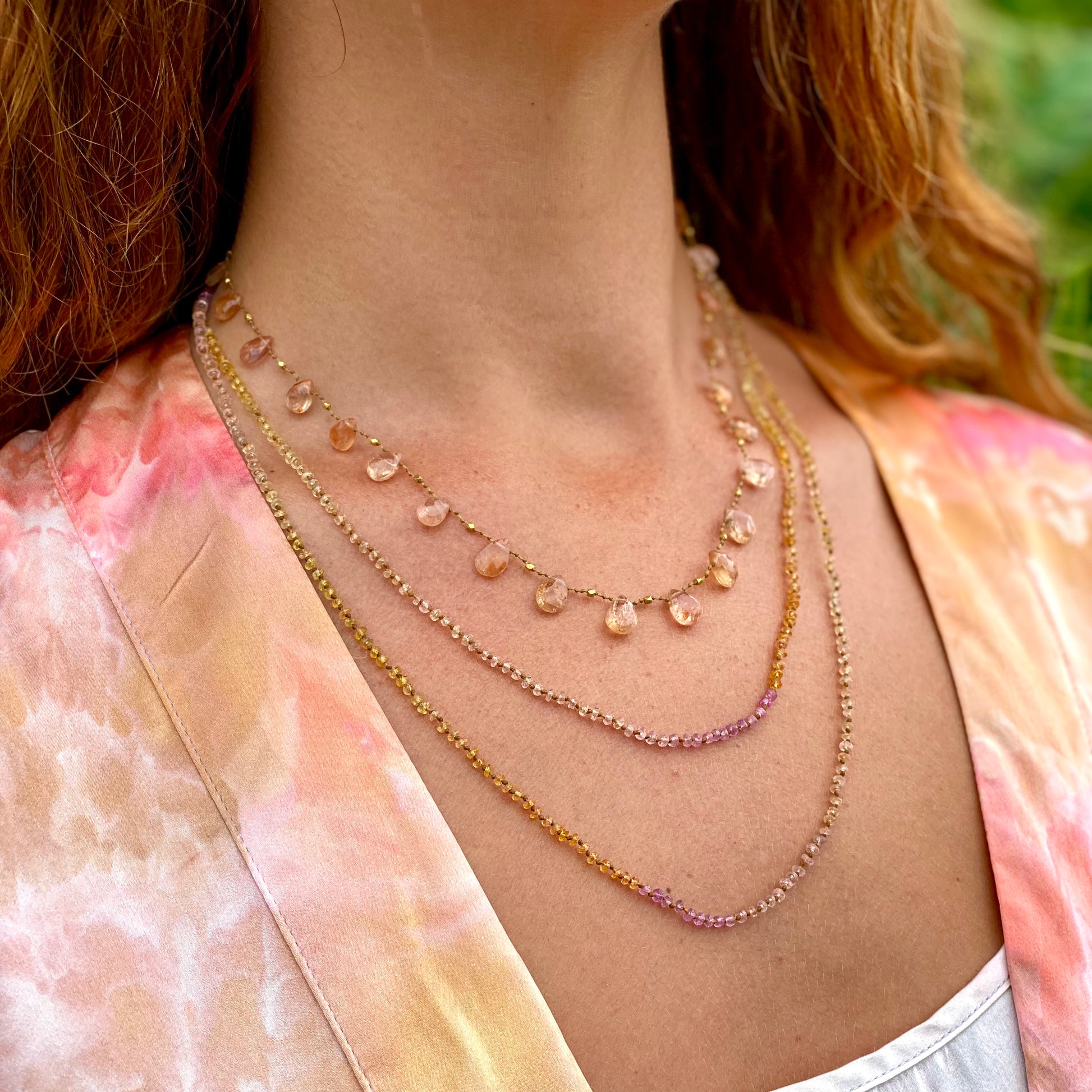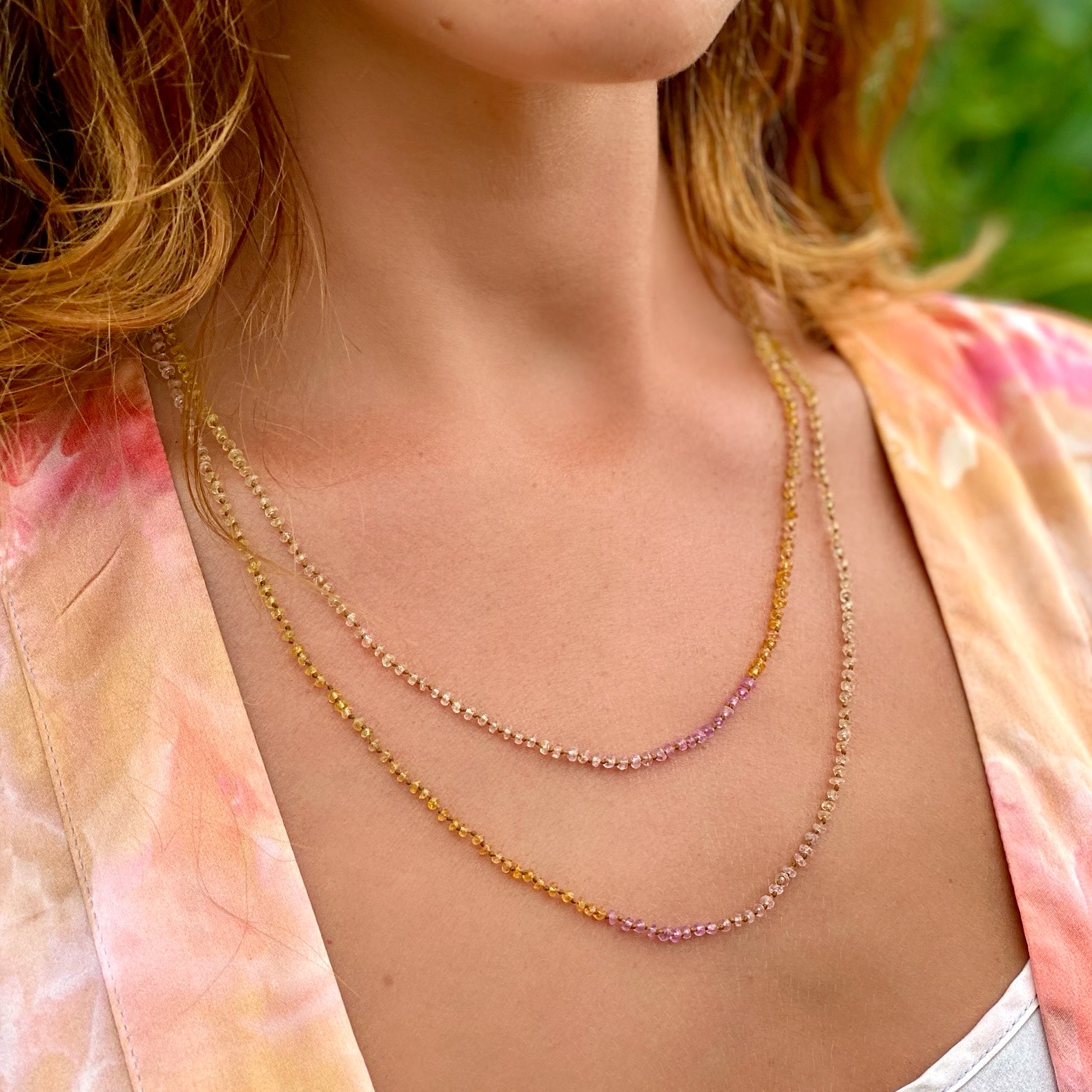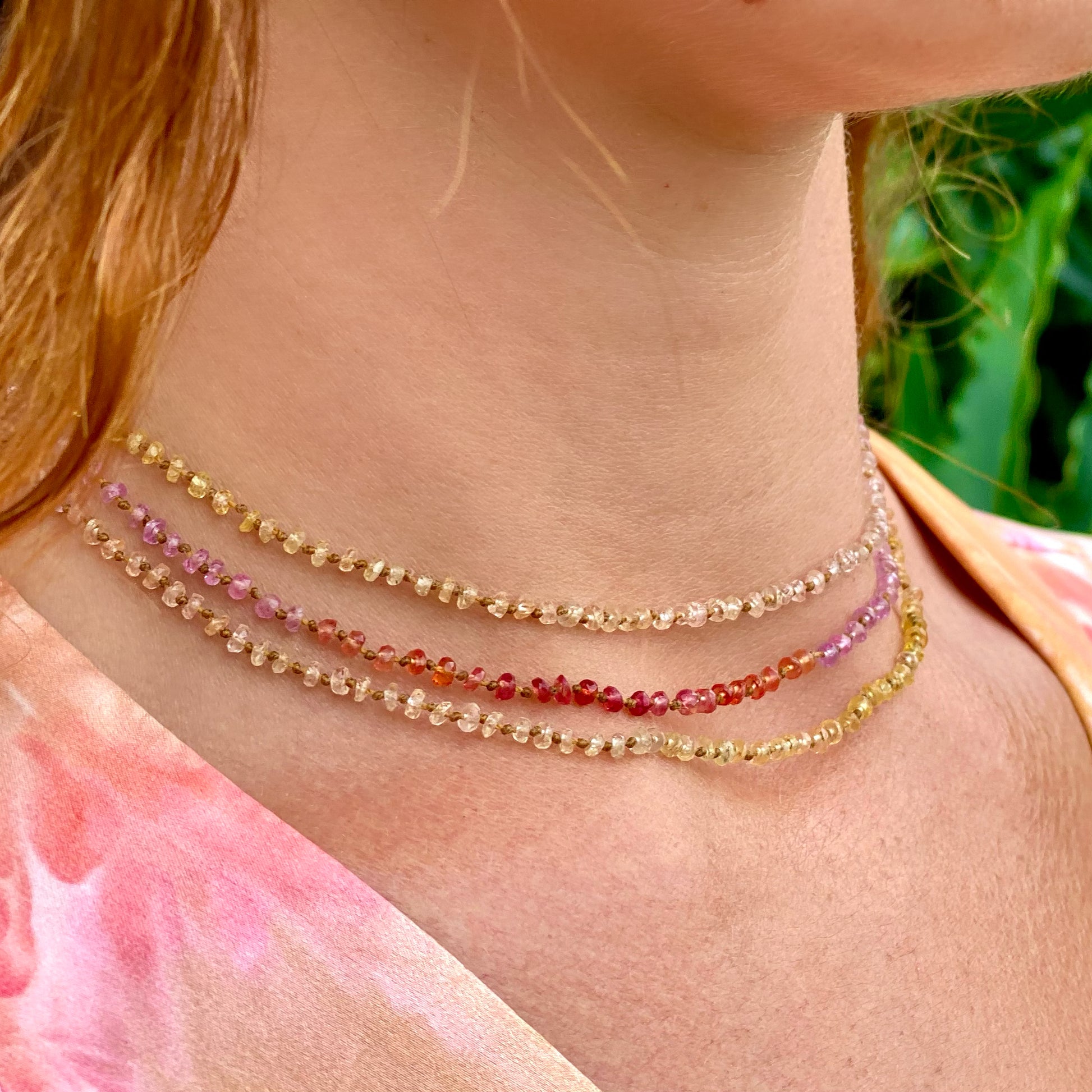 Part of our dreamy, divinely inspired Pastel Sapphire collection, this mesmerizing lei features a shimmering spectrum of warm, sunset-inspired gradated Sapphires. Can be worn single, doubled around the neck, or as a wrap bracelet.