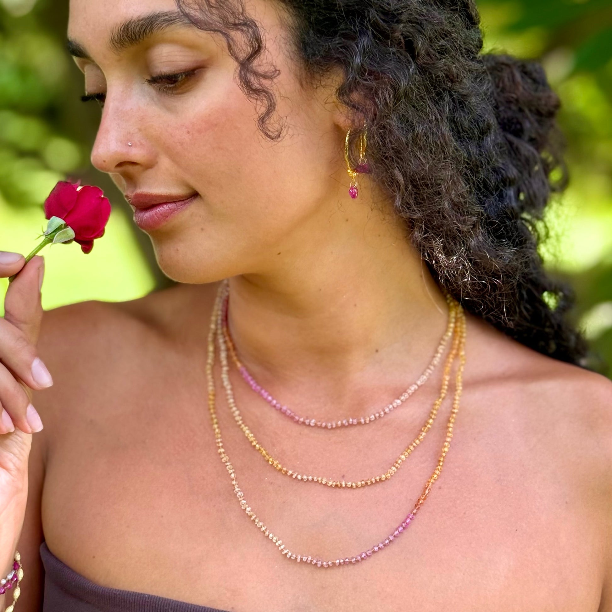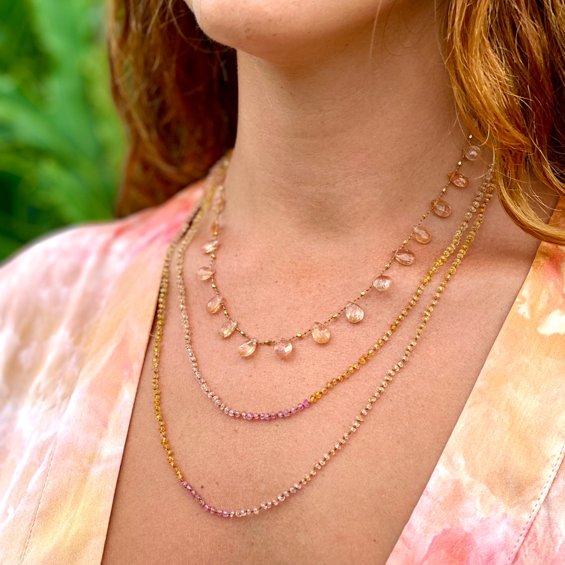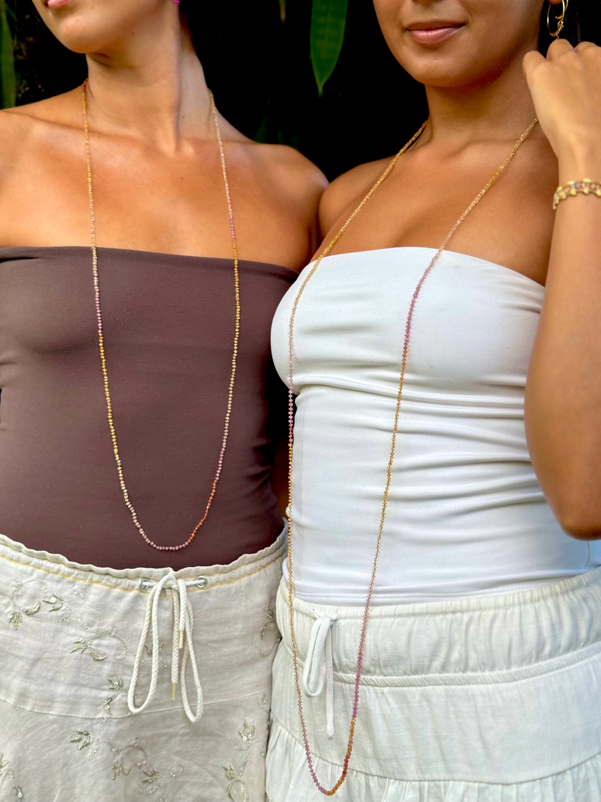 Part of our dreamy, divinely inspired Pastel Sapphire collection, this mesmerizing lei features a shimmering spectrum of warm, sunset-inspired gradated Sapphires. Can be worn single, doubled around the neck, or as a wrap bracelet.
