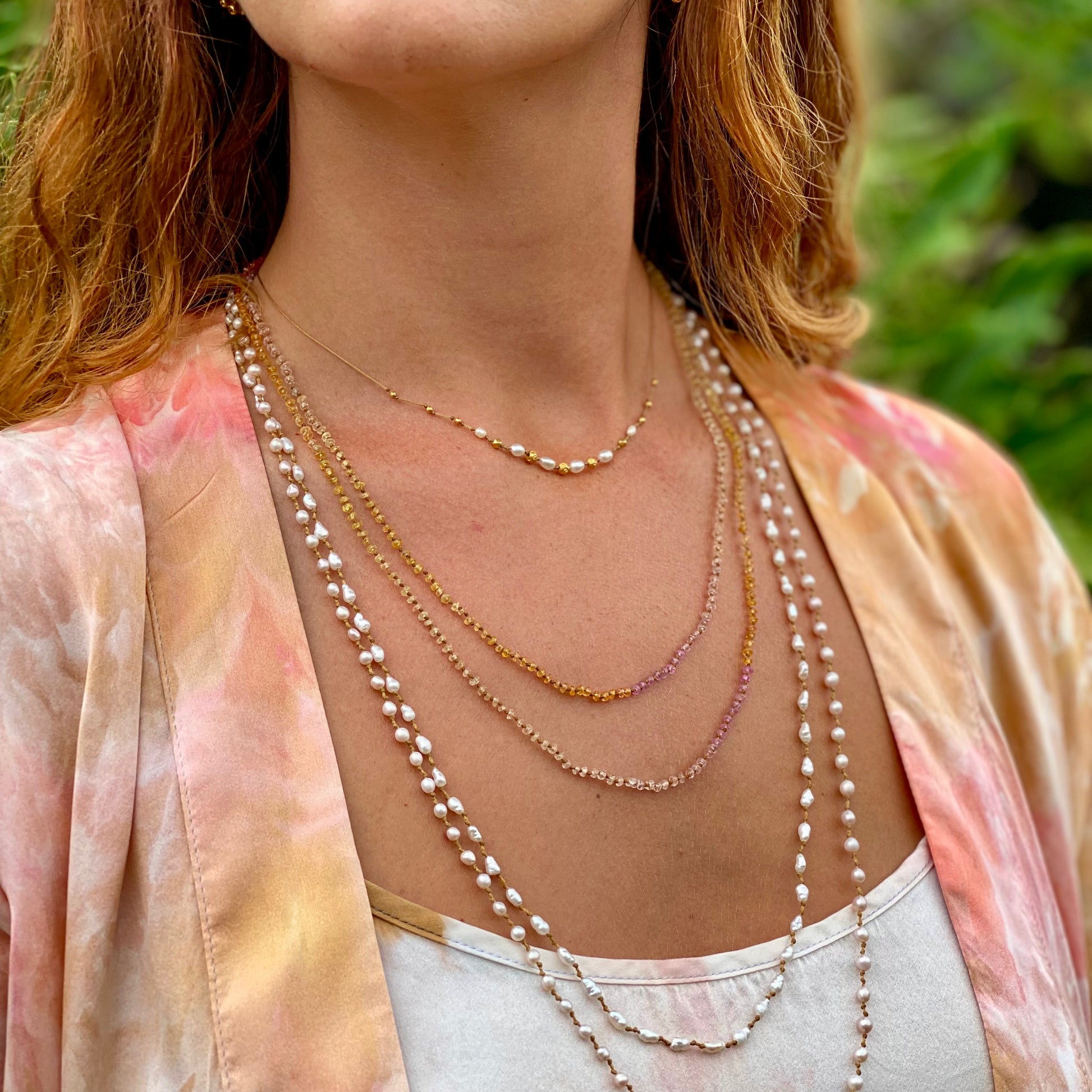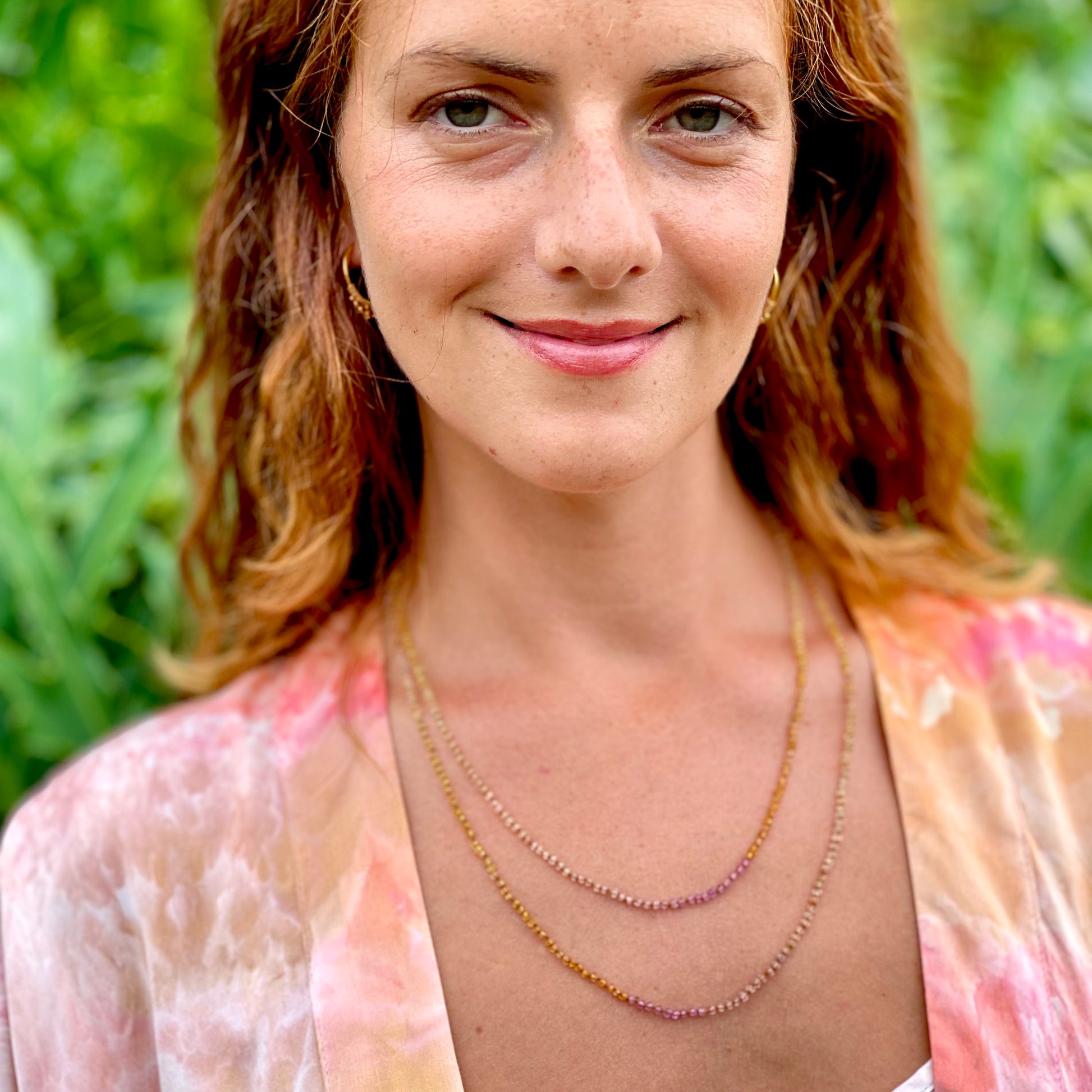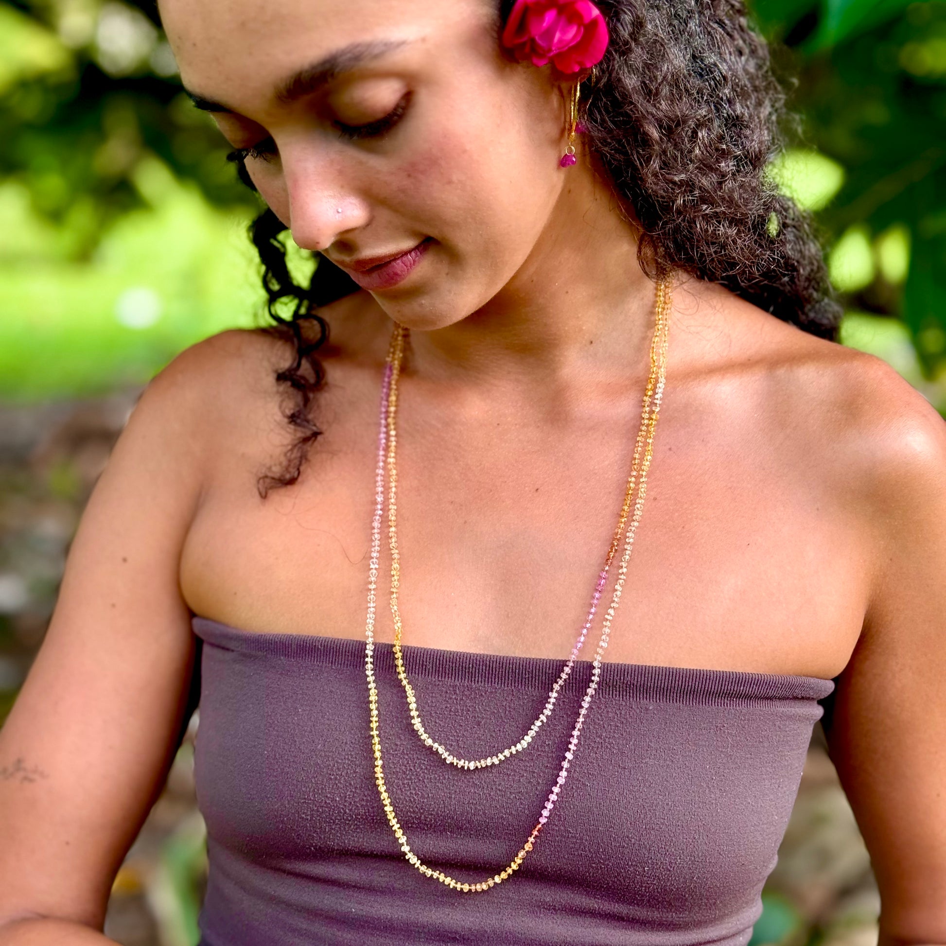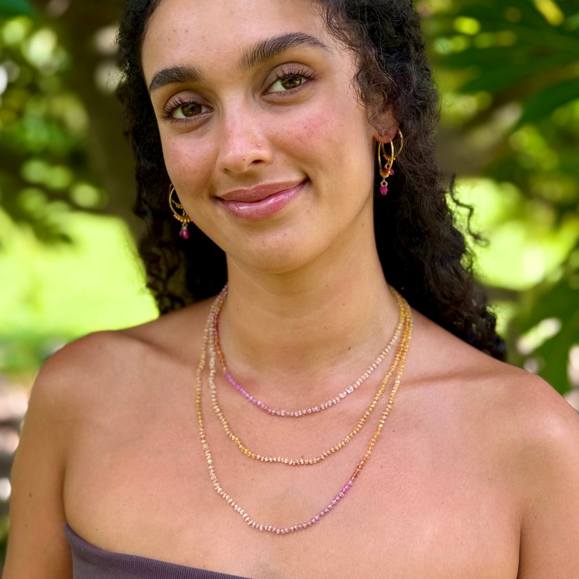 Part of our dreamy, divinely inspired Pastel Sapphire collection, this mesmerizing lei features a shimmering spectrum of warm, sunset-inspired gradated Sapphires. Can be worn single, doubled around the neck, or as a wrap bracelet.