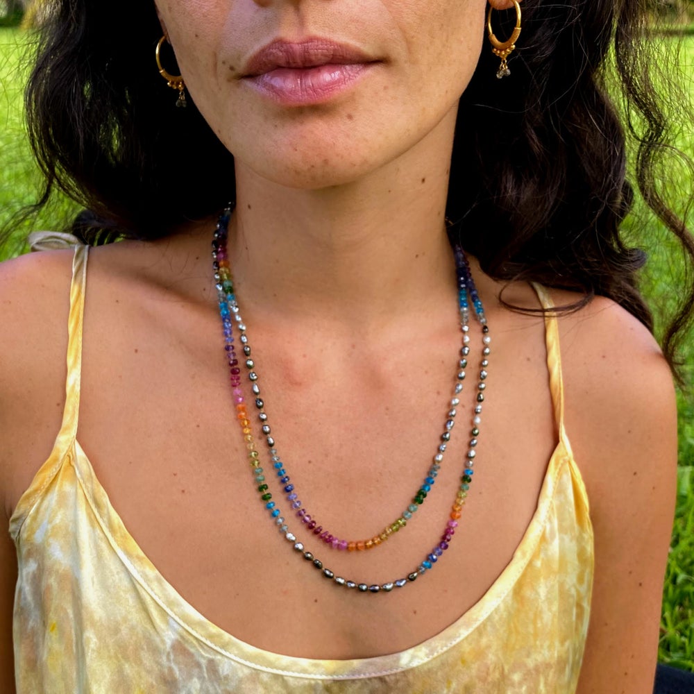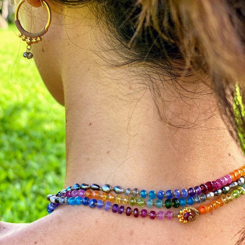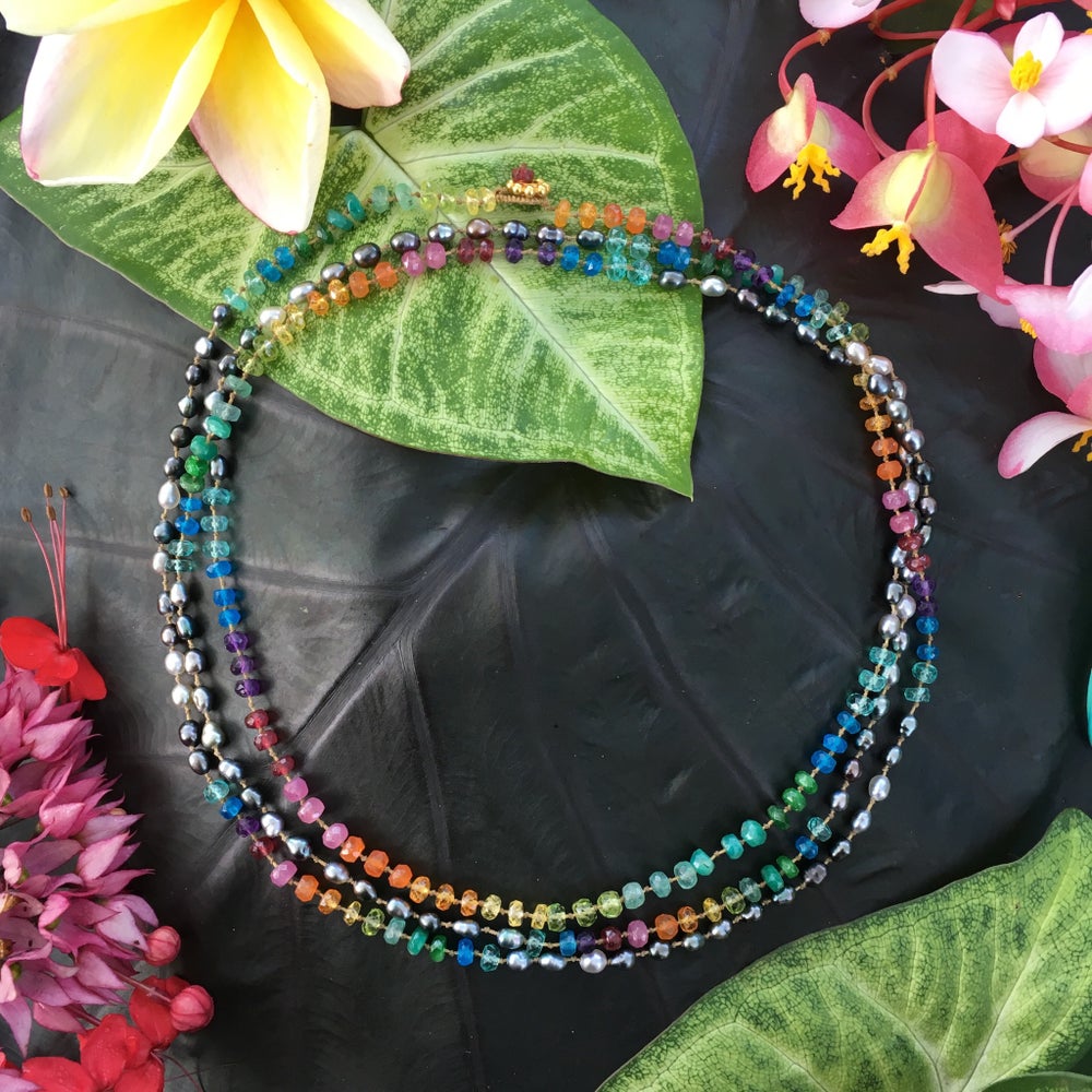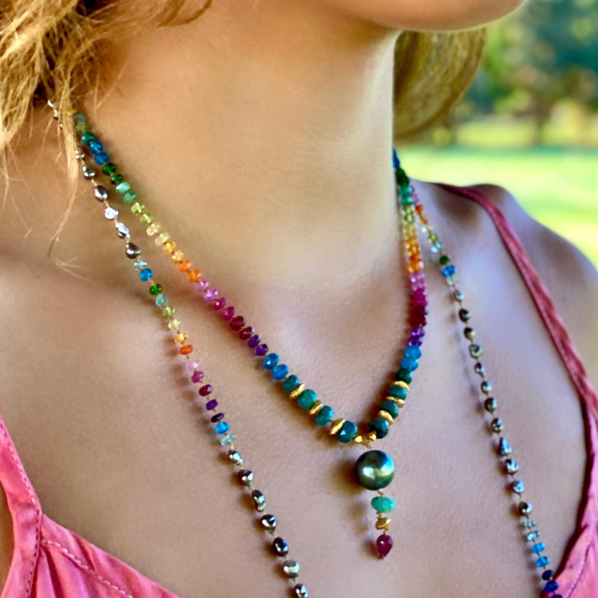 You can layer Rainbow Leis with with both our Alohi or Rainbow Drop collections. They are also a lovely compliment to our Rainbow Mana pieces and can be worn to bring forth dynamic color contrast or chosen mineral emphasis.