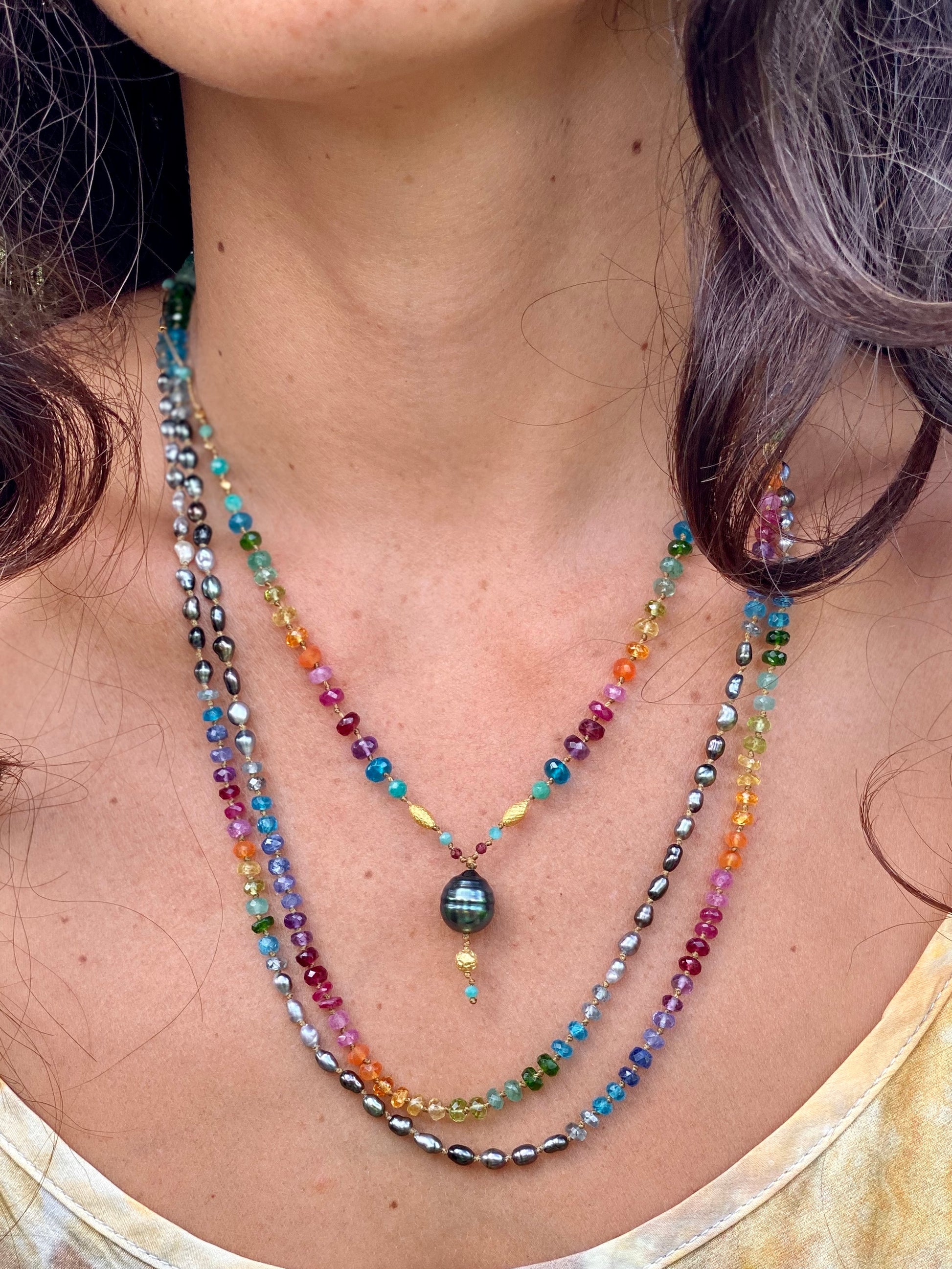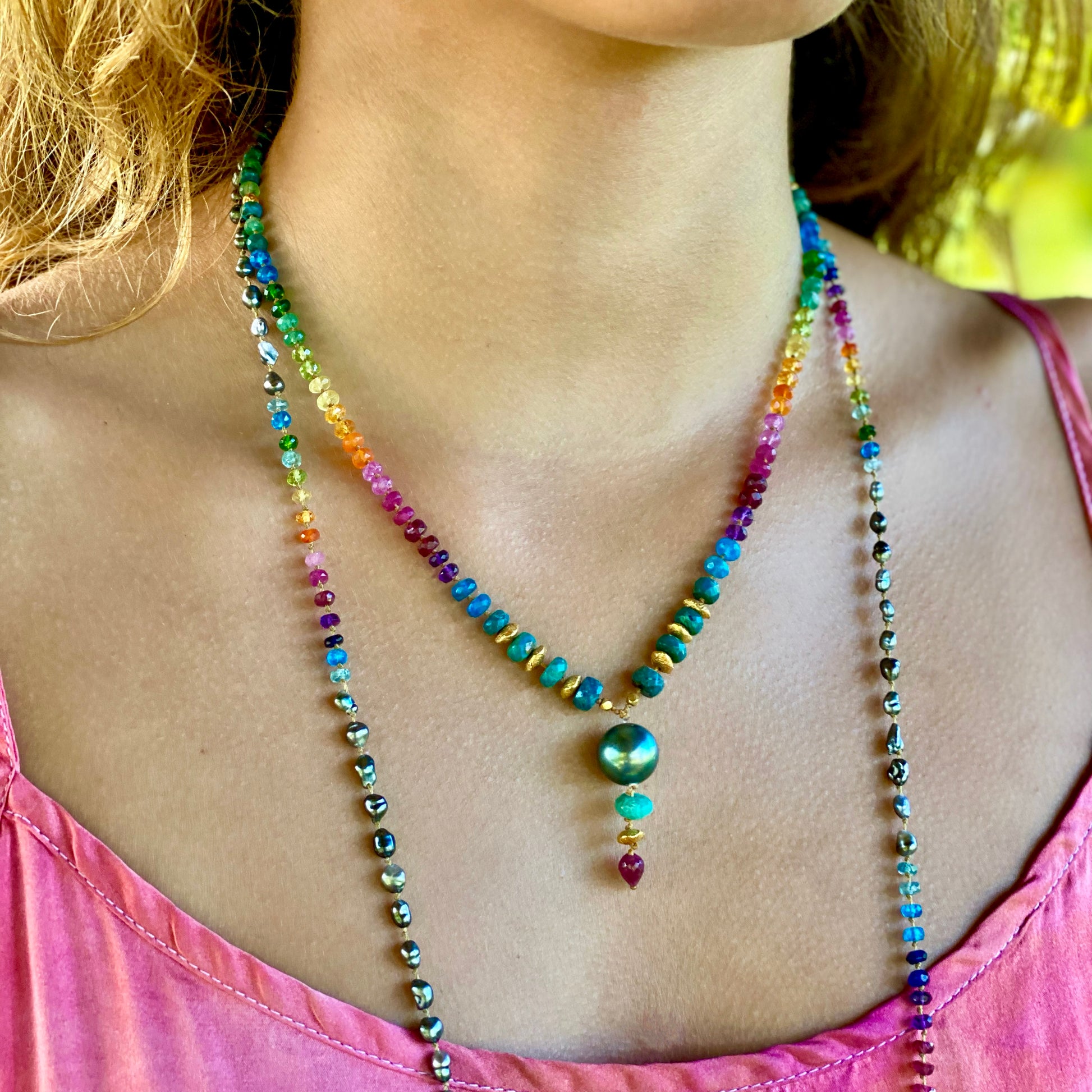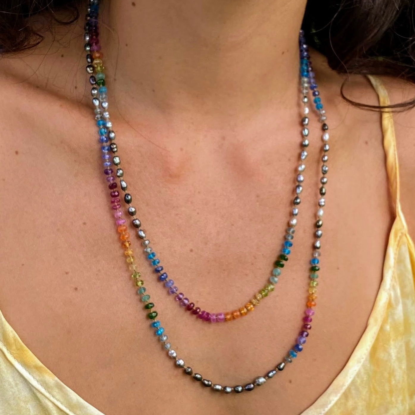 You can layer Rainbow Leis with with both our Alohi or Rainbow Drop collections. They are also a lovely compliment to our Rainbow Mana pieces and can be worn to bring forth dynamic color contrast or chosen mineral emphasis.