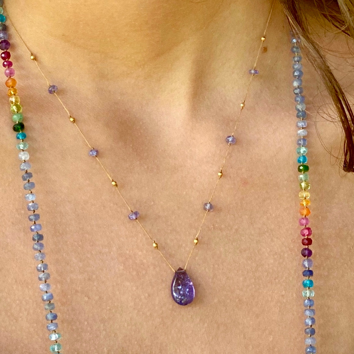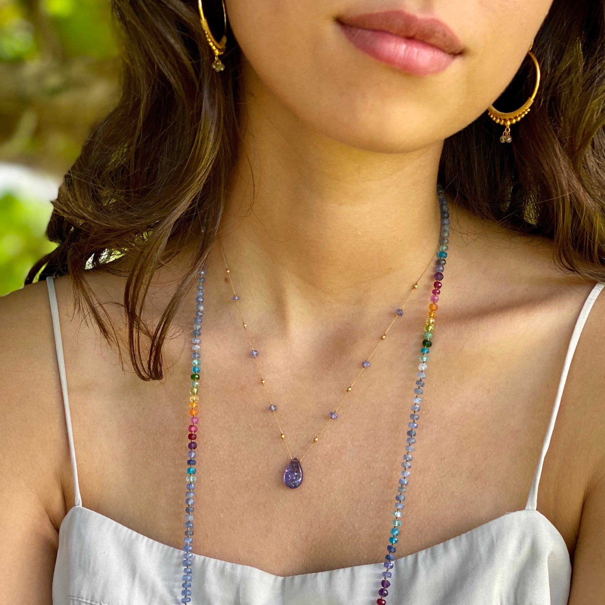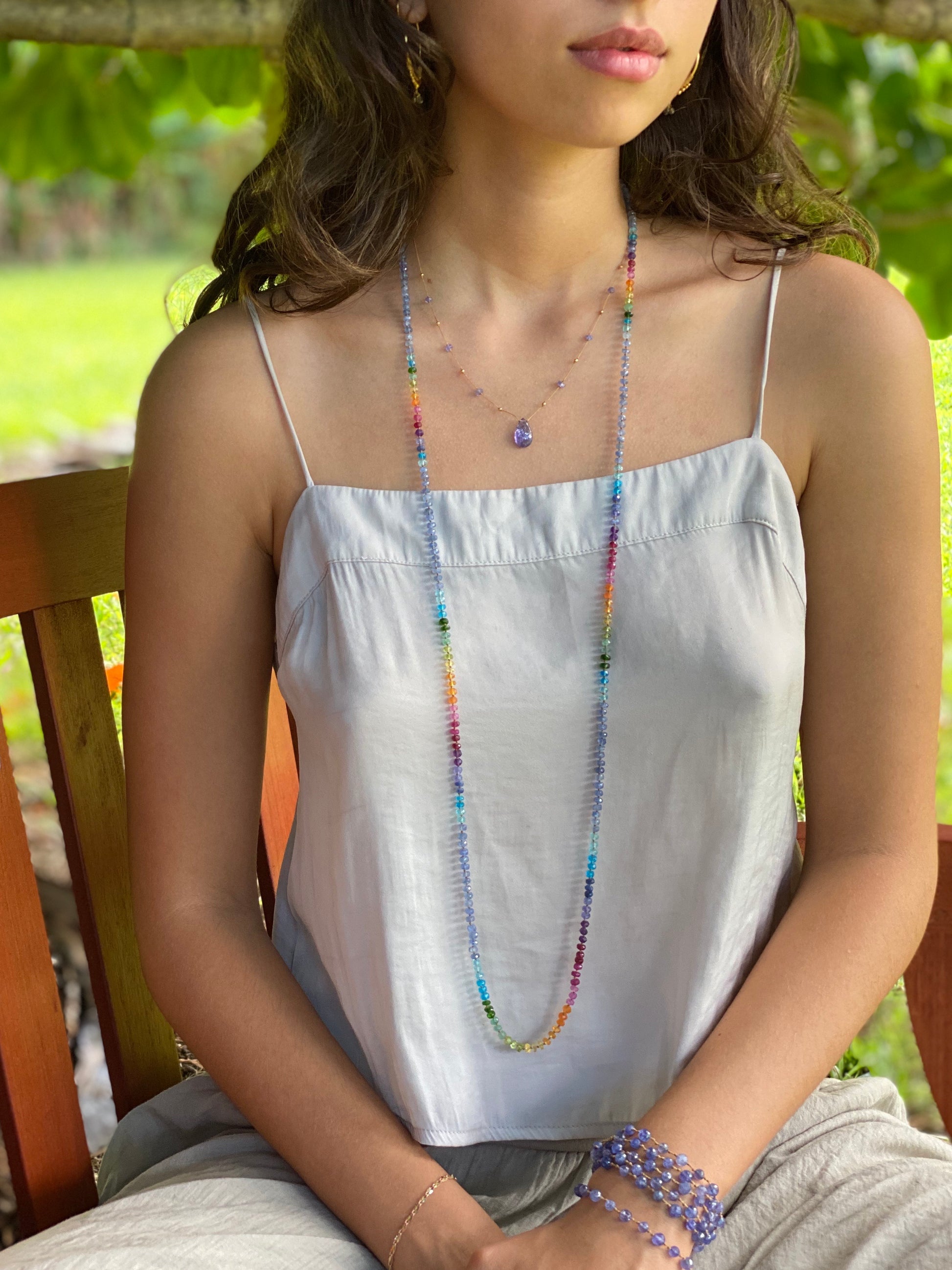 United in a shining continuum, each strand features a faceted gemstone drop and includes a repeating sequence of coordinating gemstone beads alternated with hand built gold beads.