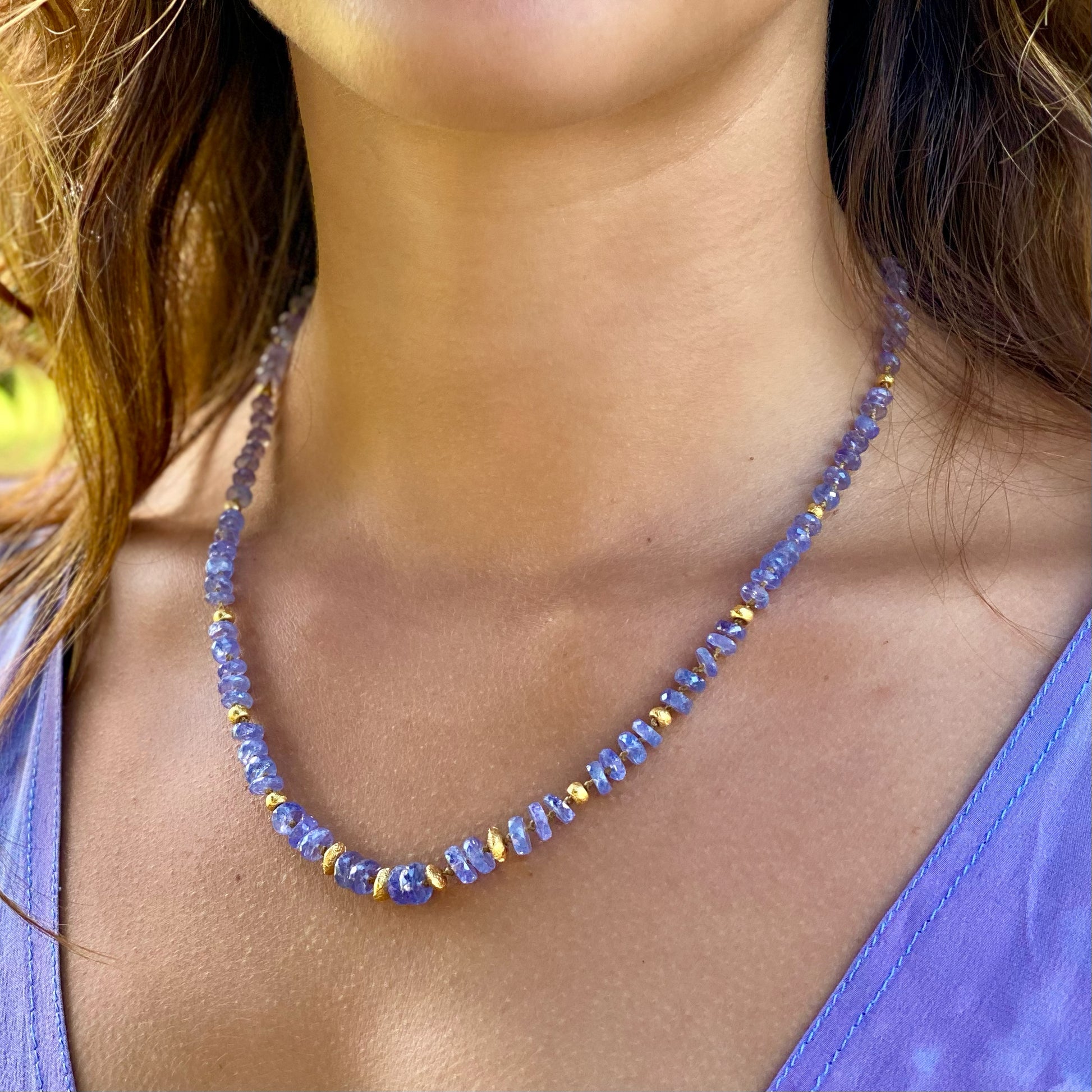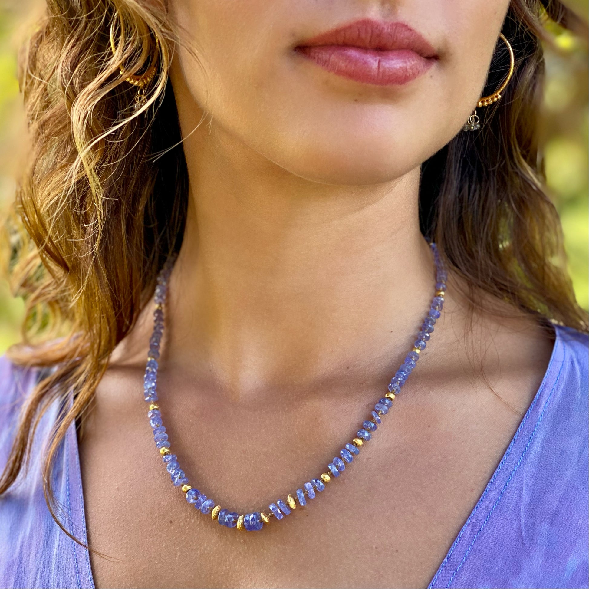 Gorgeous, gradated Tanzanite wheels set apart by handmade solid 18k gold beads give this mystic piece its captivating allure and transformational frequencies.