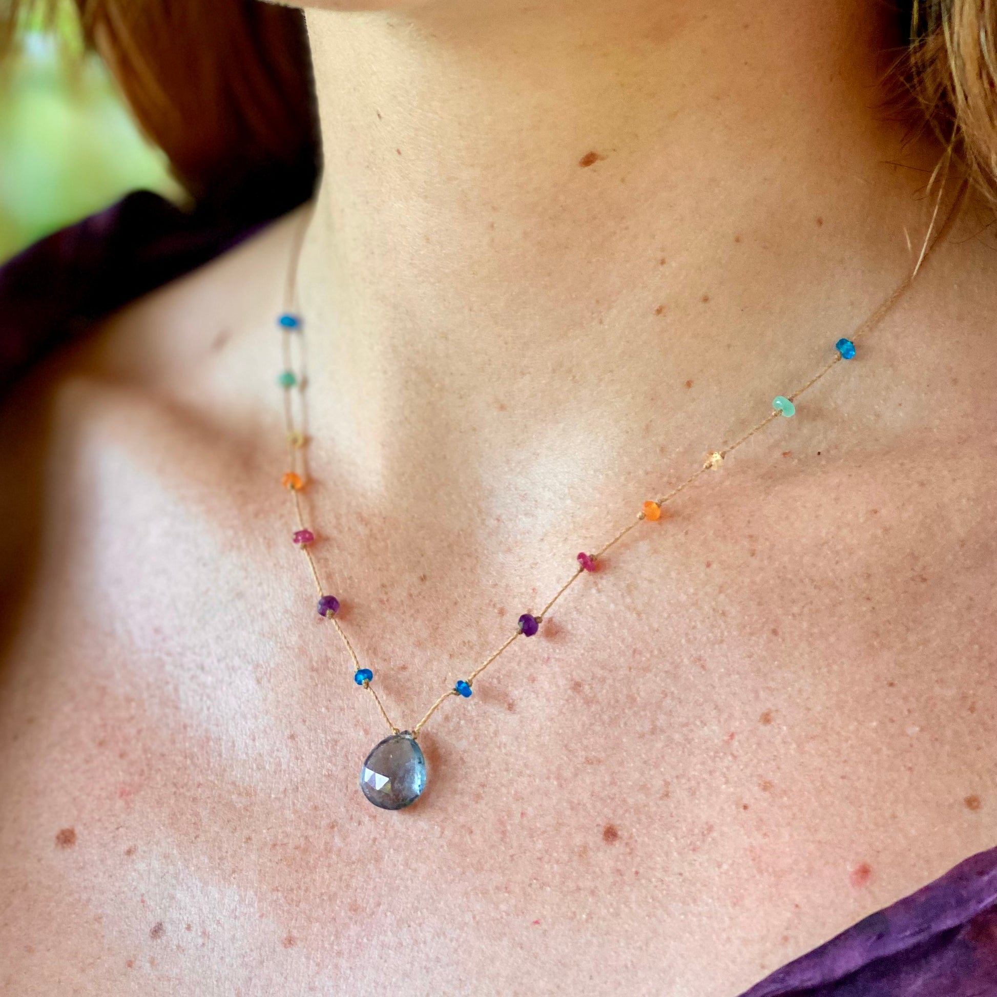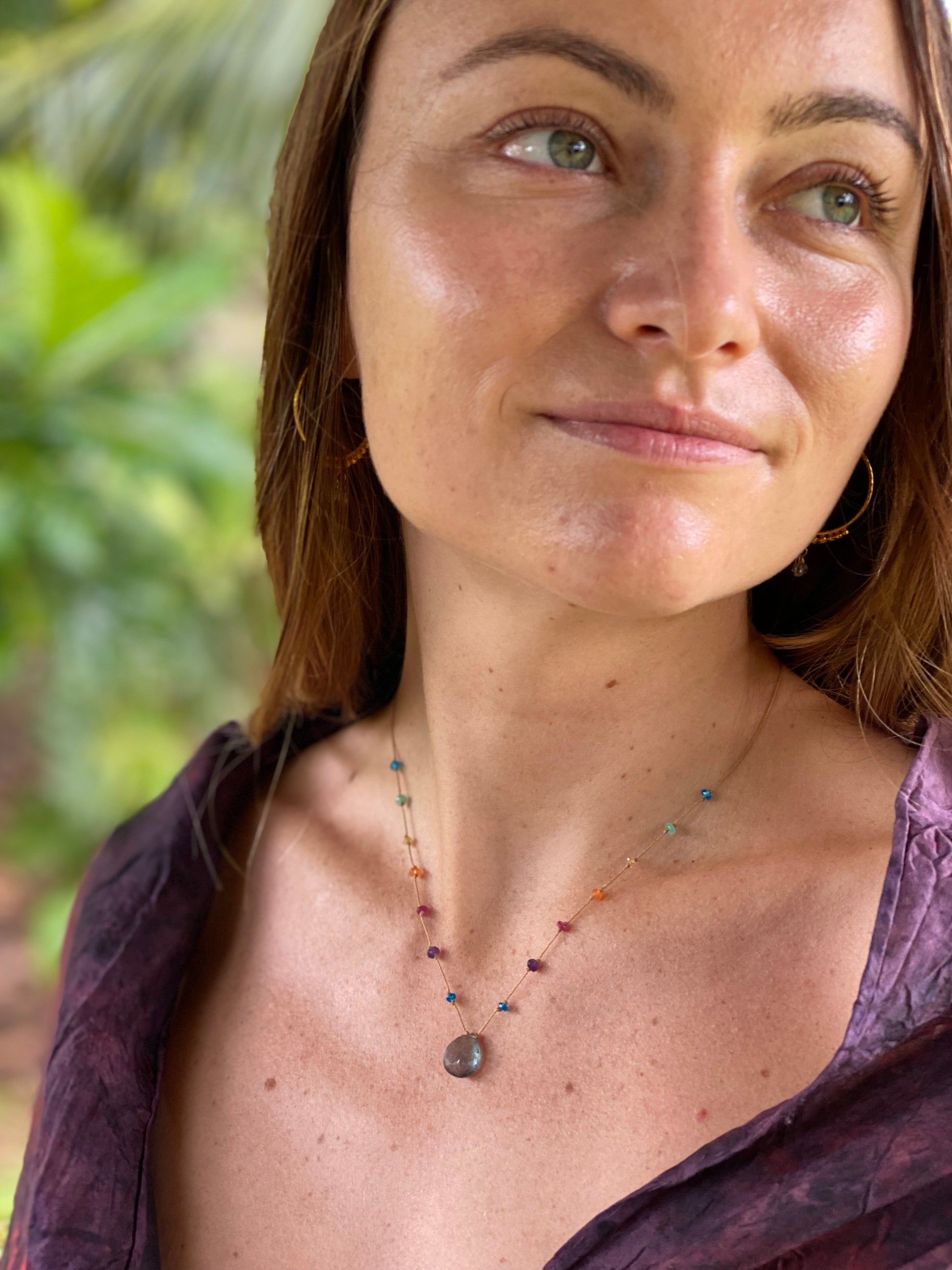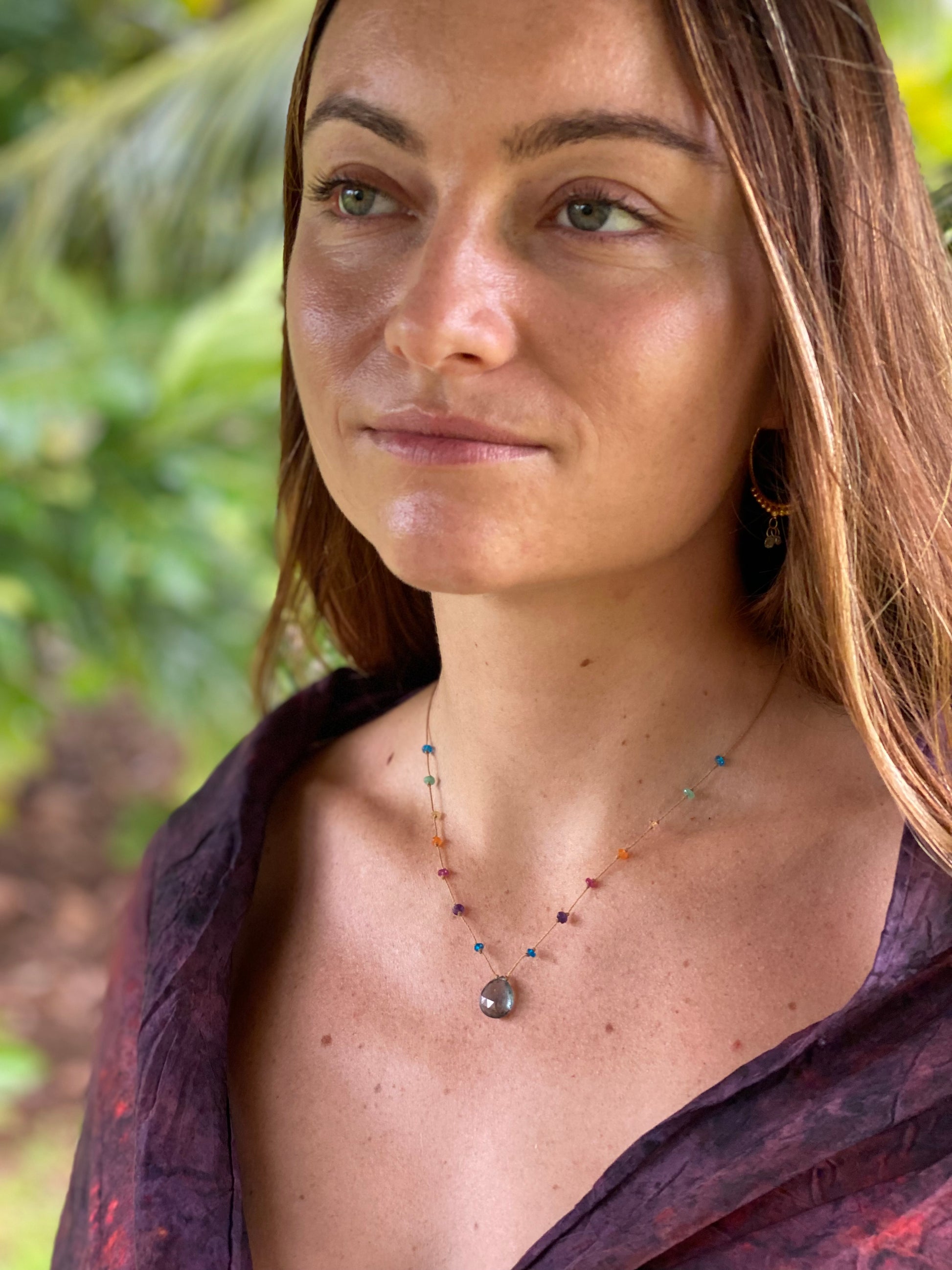 Perhaps the quintessential beginning of Rainbow Gems Kauai, our rainbow drops have been adorning people for over a decade. These delicate rainbow drops showcase the full light spectrum with carefully spaced individual gemstones, culminating in a featured crystalline drop. Just as rainbows herald new beginnings and luck these exquisite strands are the perfect place to begin your love affair with Amalia’s artwork. Many find that once they put on their rainbow drop they never take it off again, such is the nature of love. These strands are perfect for the minimalist at heart and make a striking impression stacked in a series with our other collections.