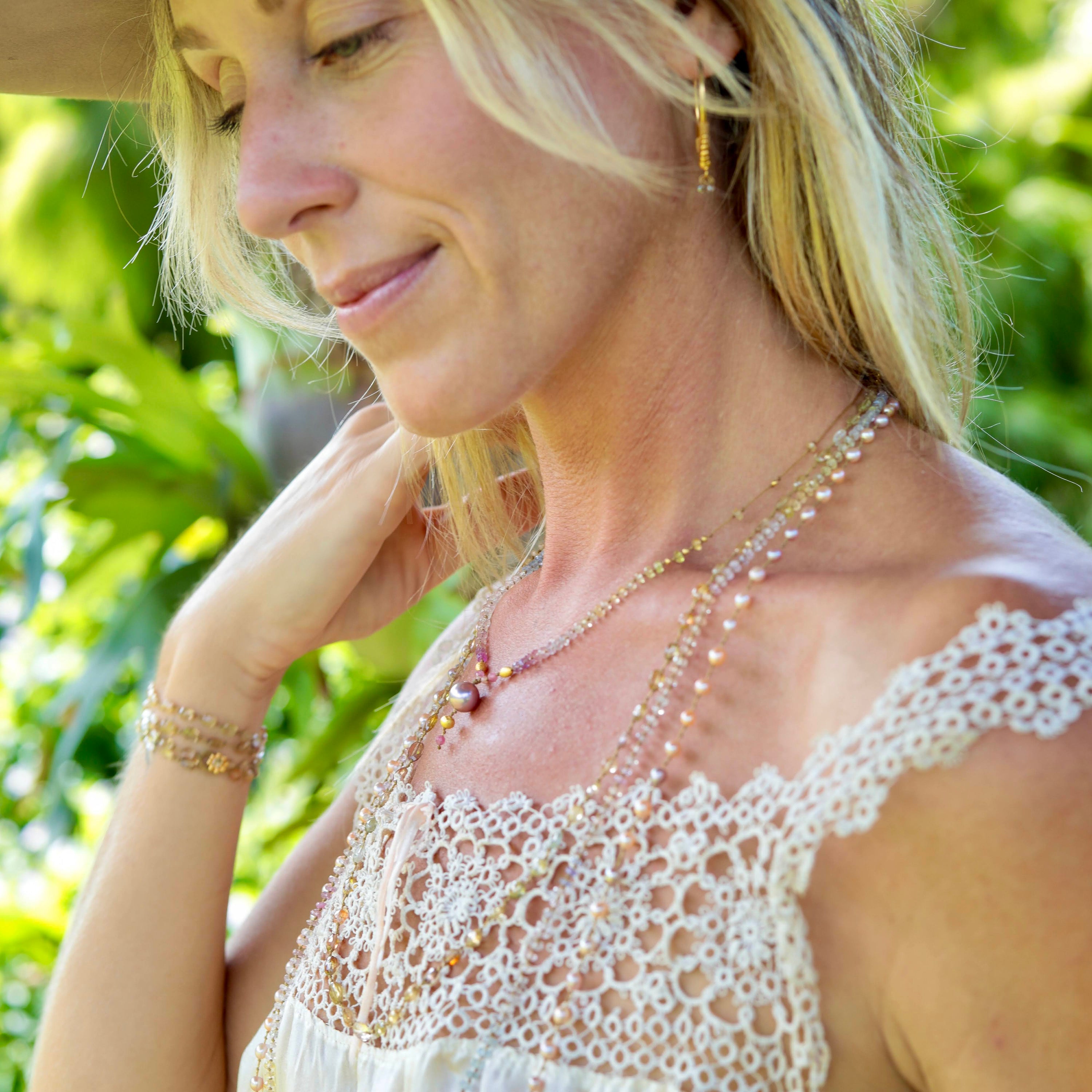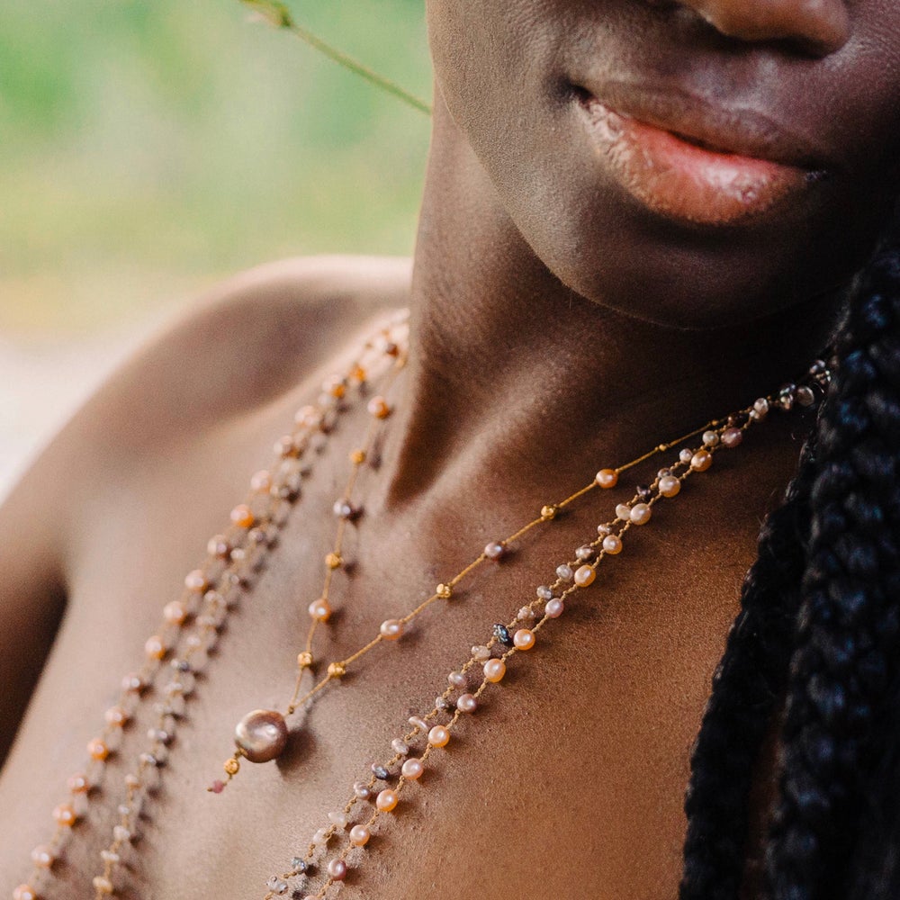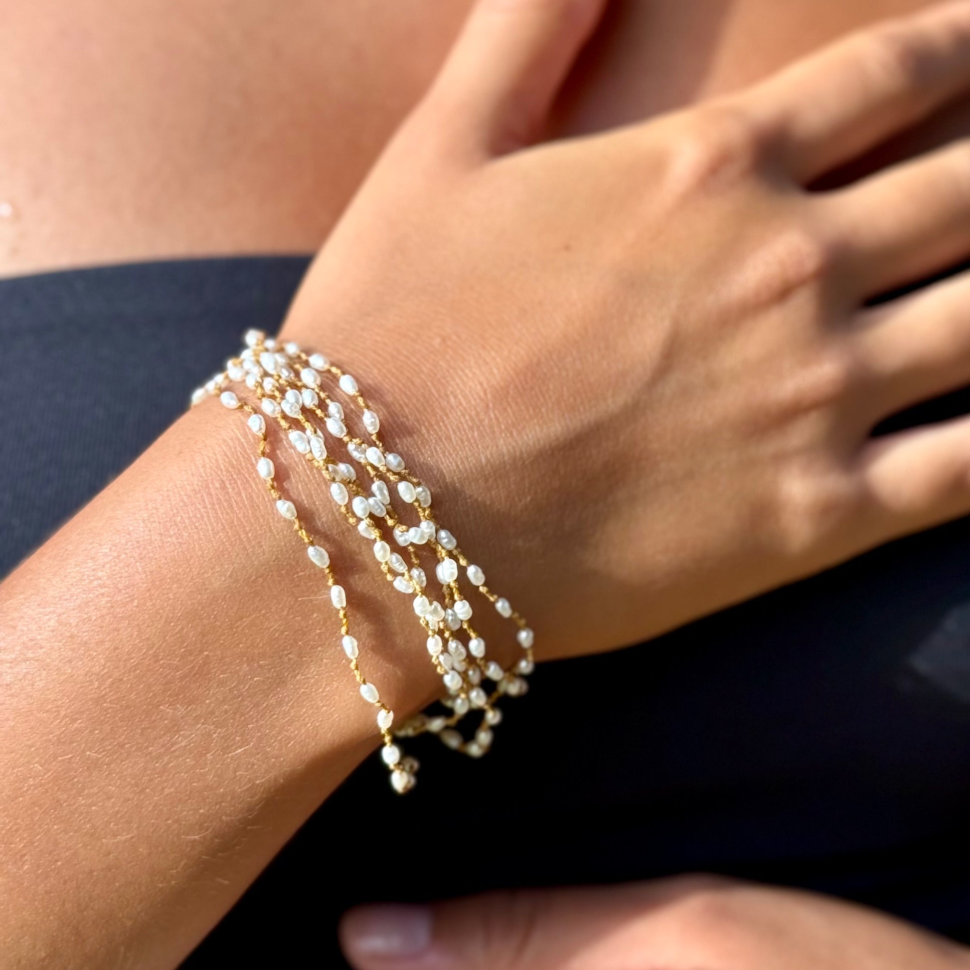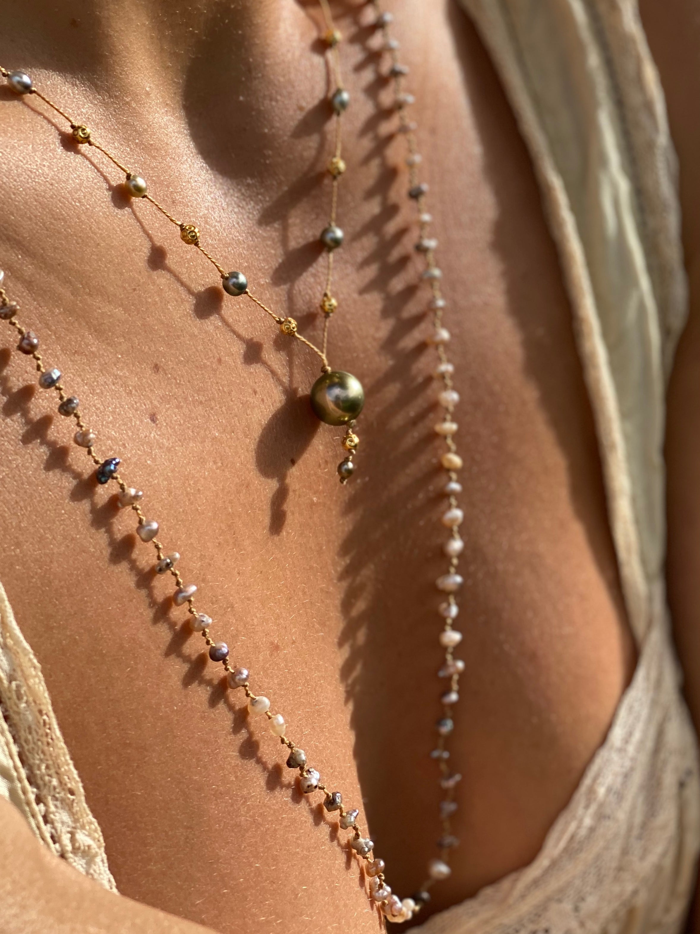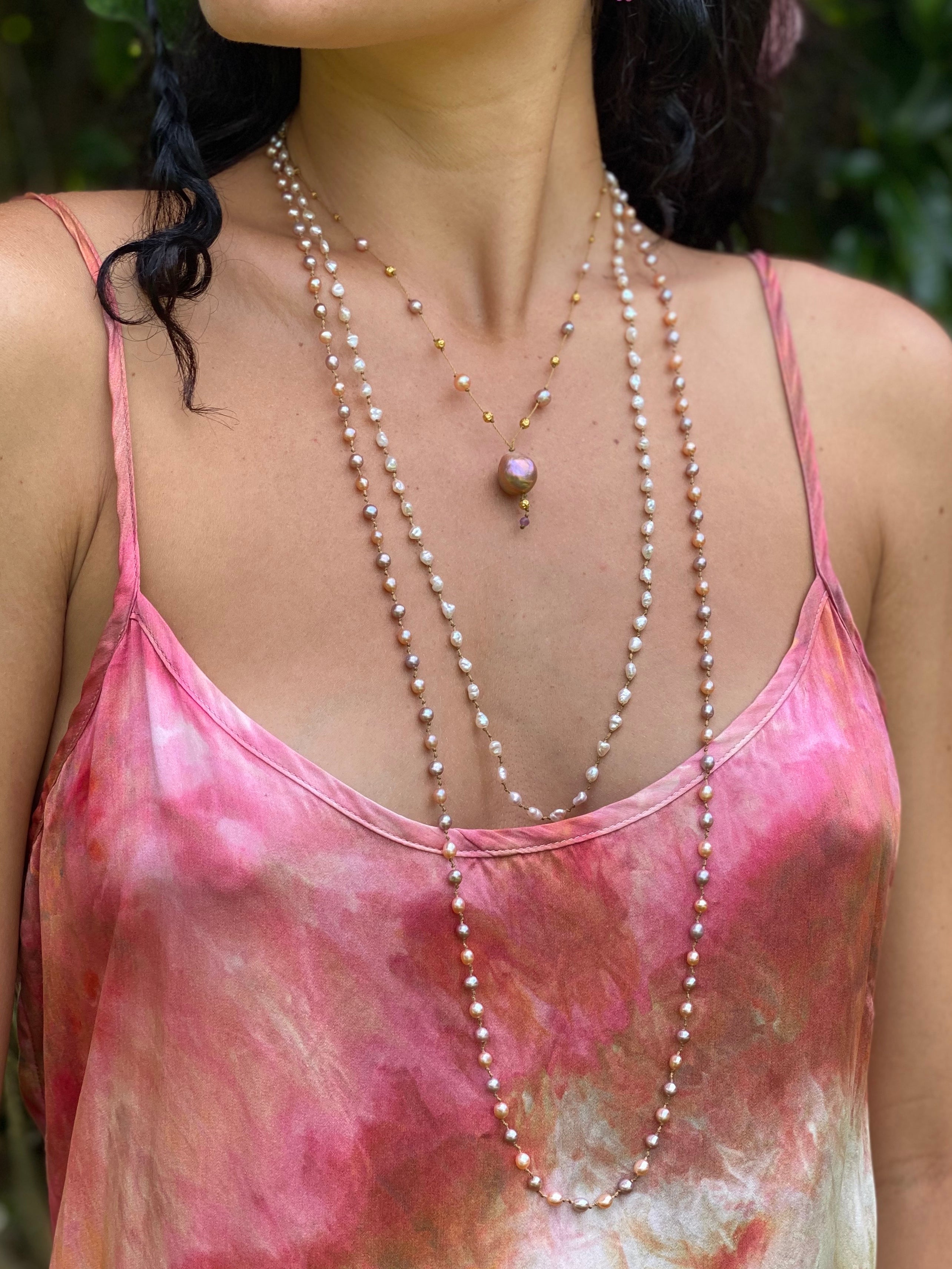 Both classic and forever fresh, these tiny organically formed Freshwater Pearls are hand knotted showcasing their unique shapes and delicate nature. Can be worn as a single long strand, doubled, tripled, or as a wrap bracelet.