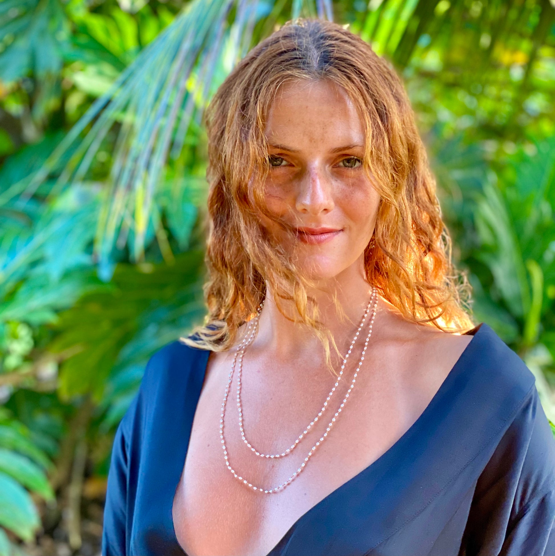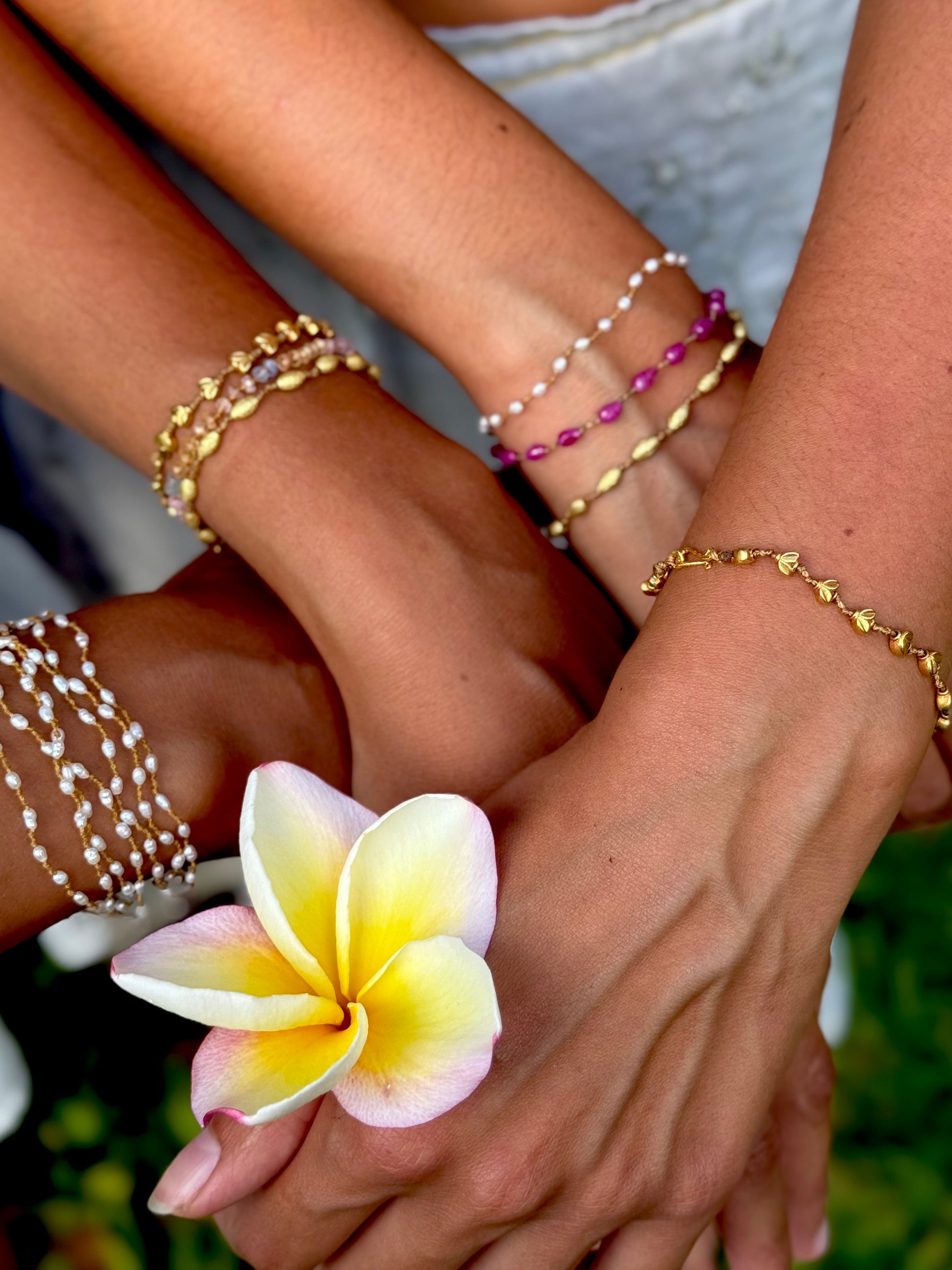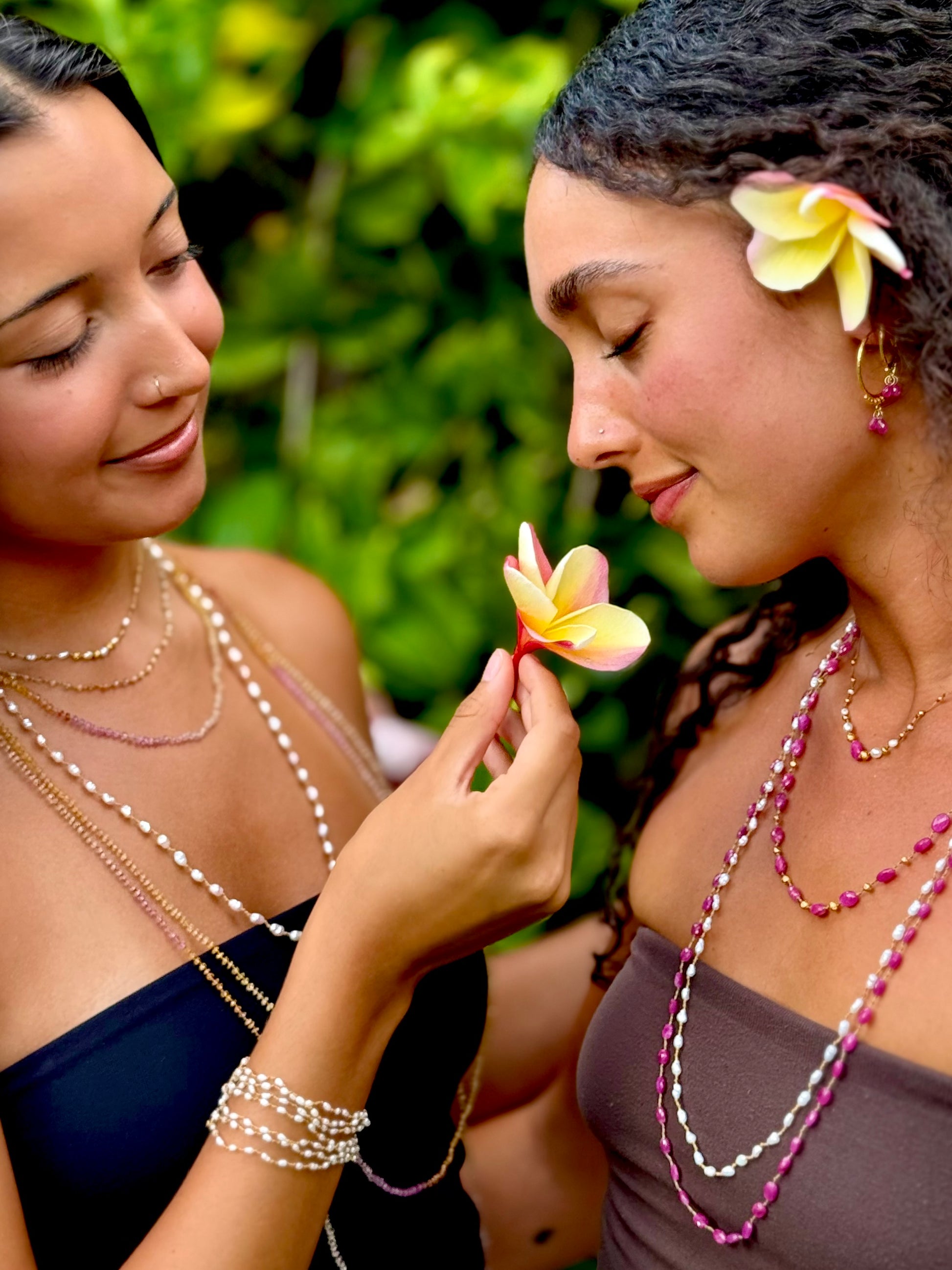 Try layering pearls with other pearl pieces, highlighting the structural differences between varying collections, such as a pearl Alohi Drop with a pearl lei or mala.