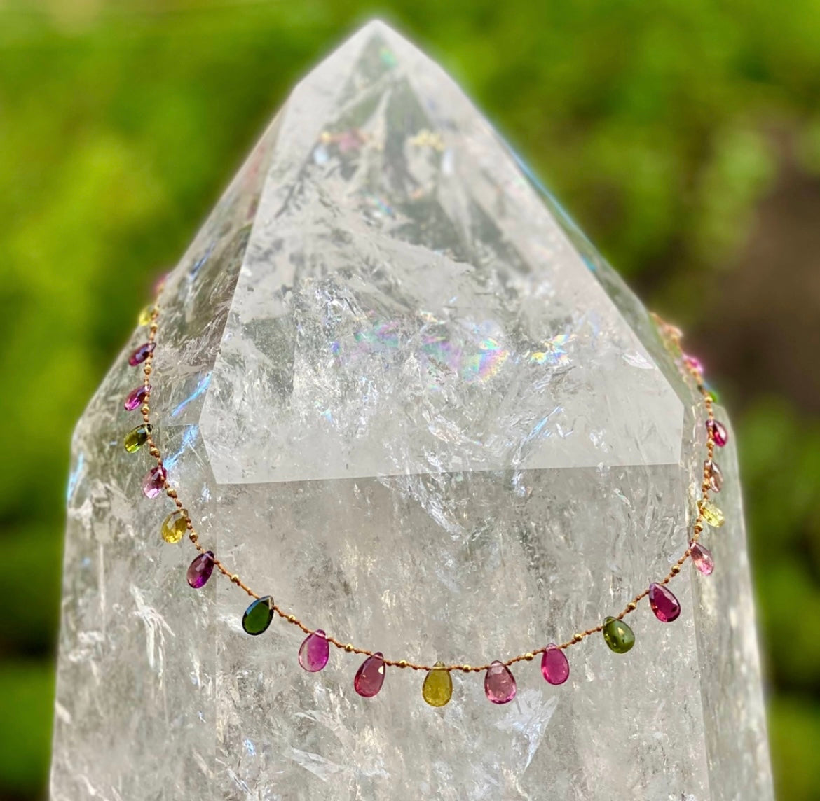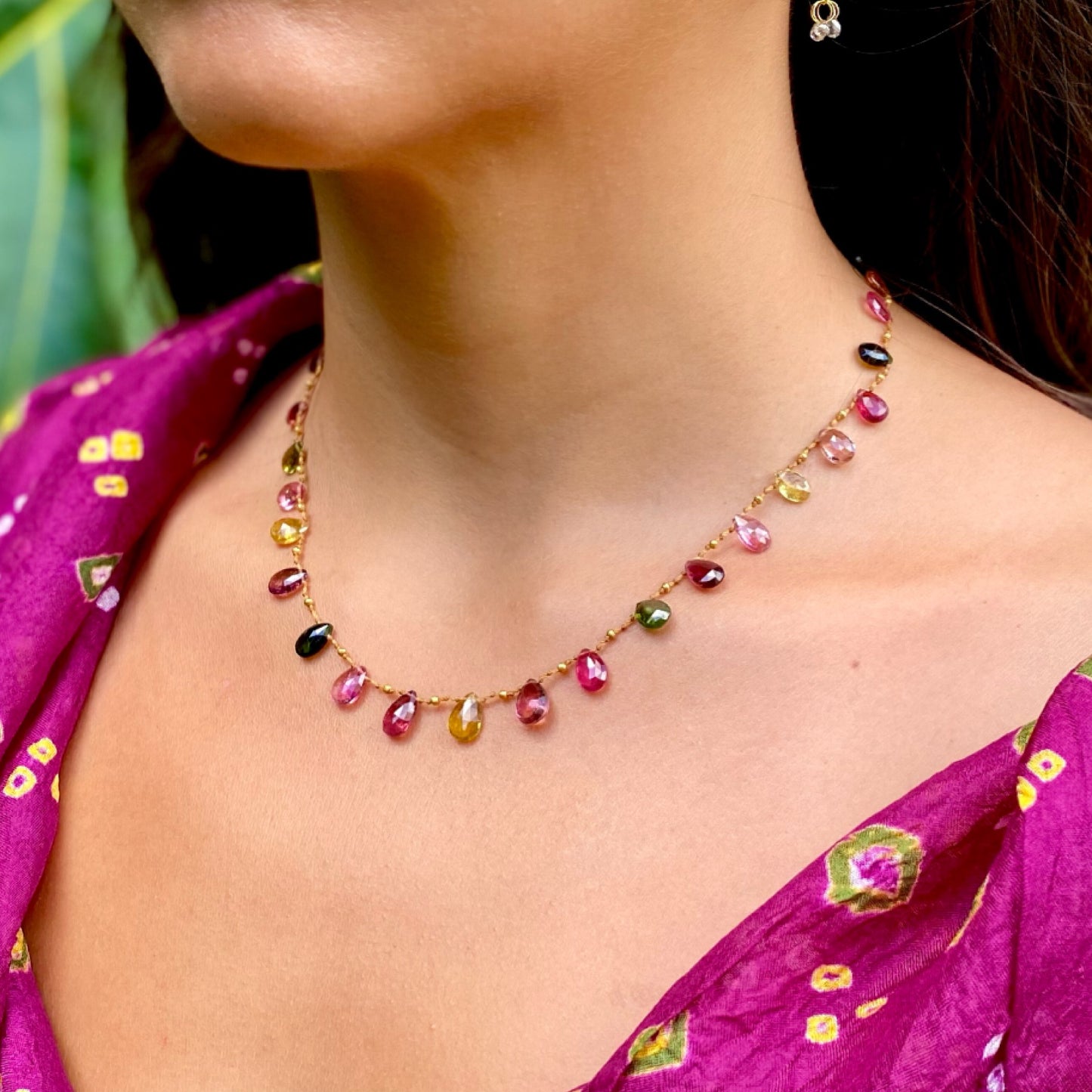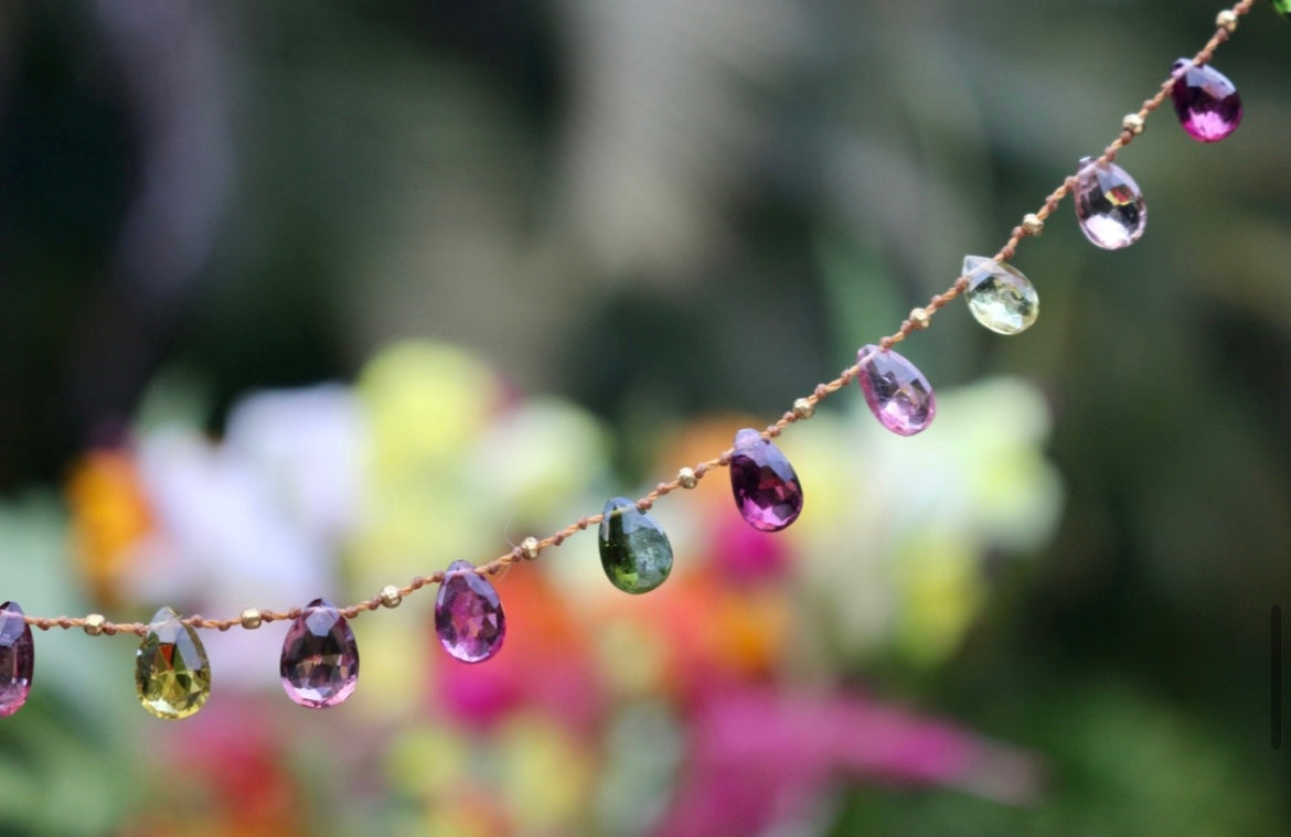 Delightful and colorful Multi-Tourmaline drops delicately spaced with handmade solid 18k gold beads