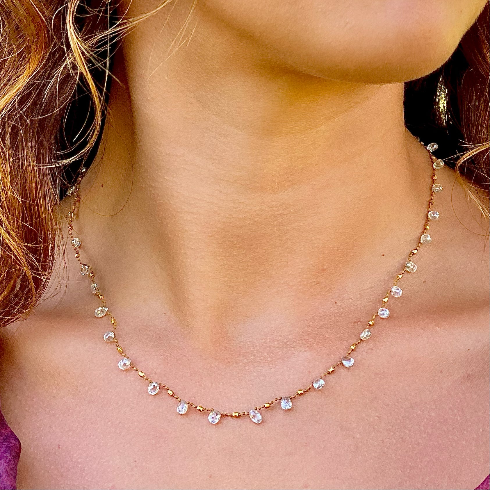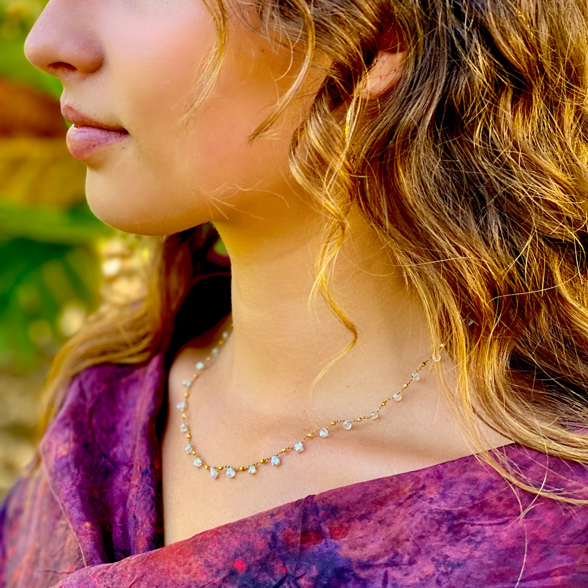A resplendent halo of premium AAA White Diamond drops delicately spaced with handmade solid 18k gold beads in our Royal Ali’i style. The forever gemstone, this stunning classic heralds invincibility of spirit, purity, wisdom, faithfulness, and eternal beauty.