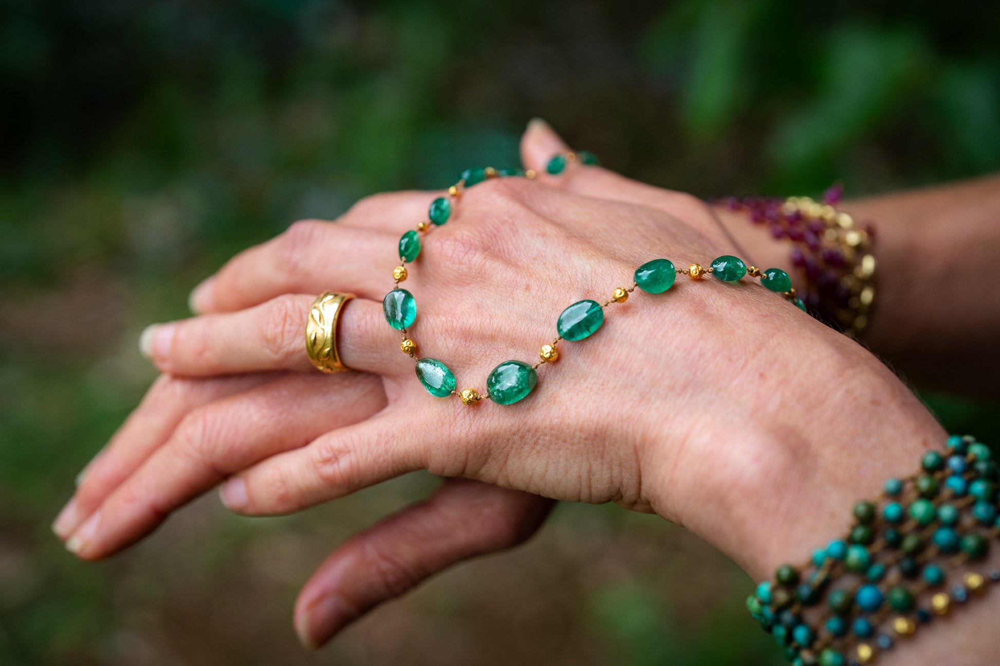 Premium Zambian Emerald ovals with handmade solid 18k gold beads. Known for their high clarity, these shining Zambian Emeralds radiate peace and plenty stacked with amplifying gold and a dose of regal fecundity.