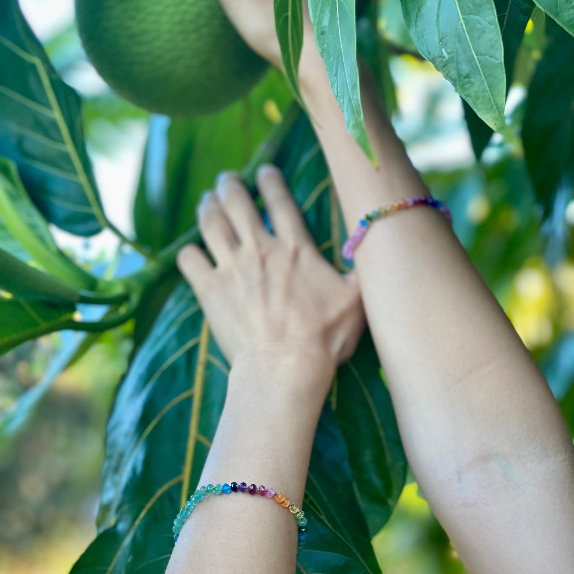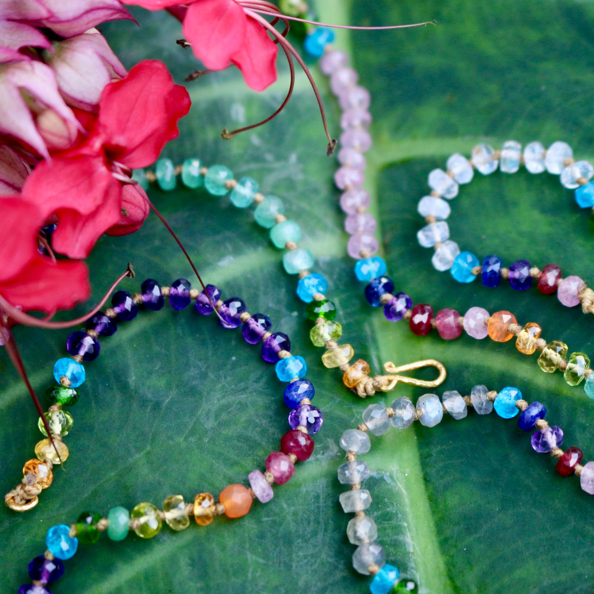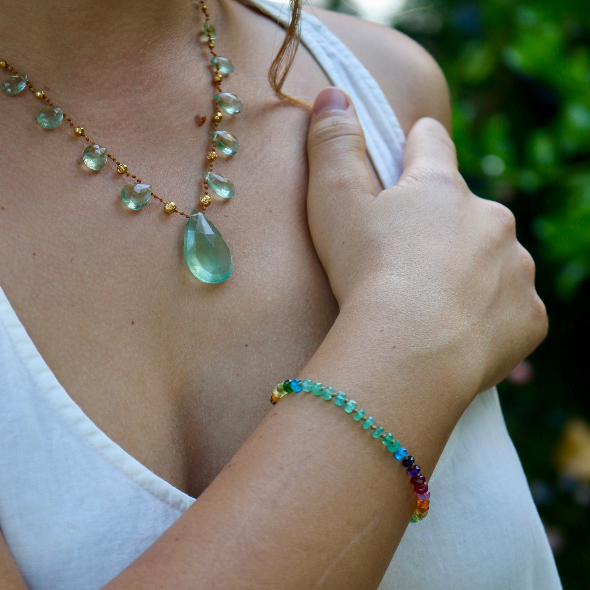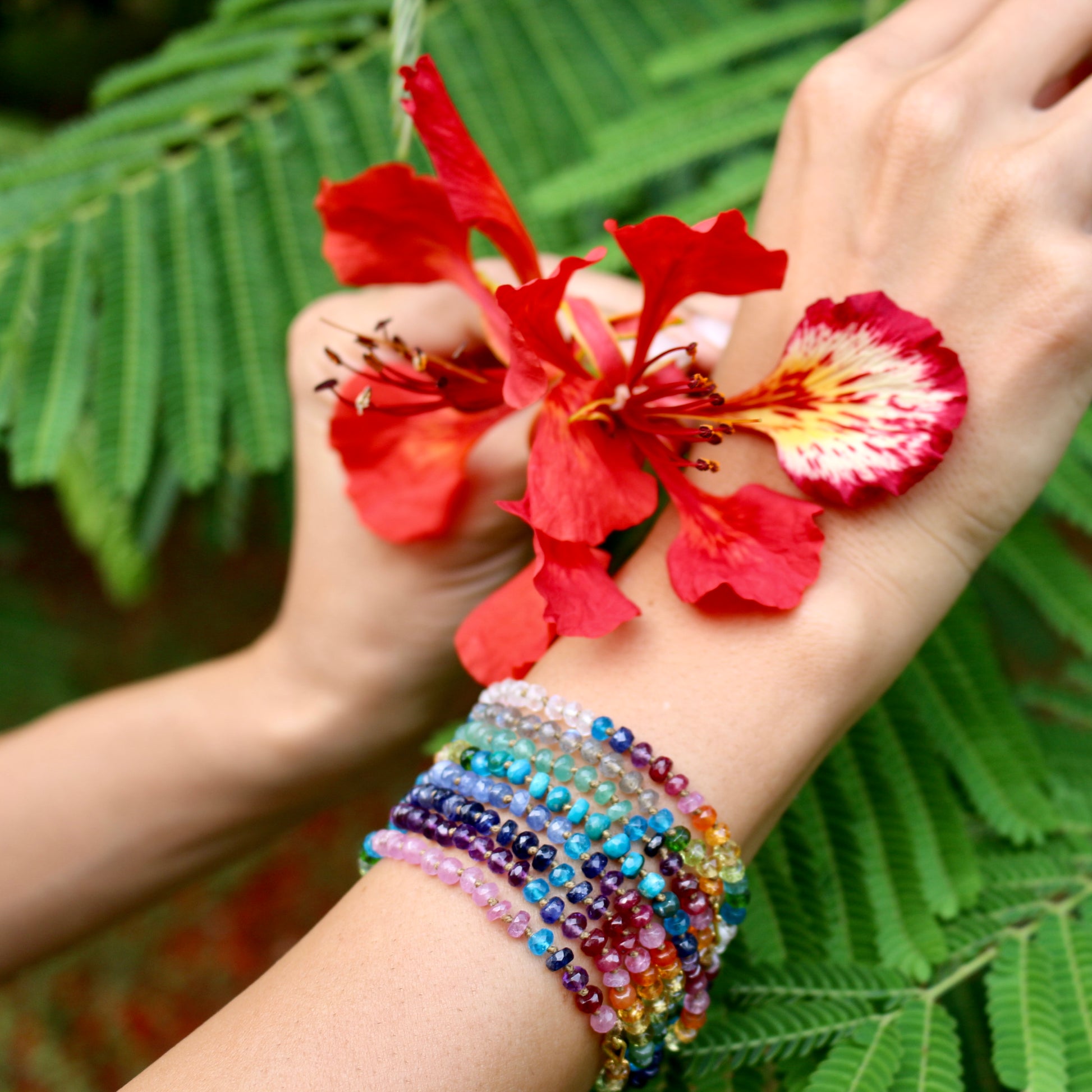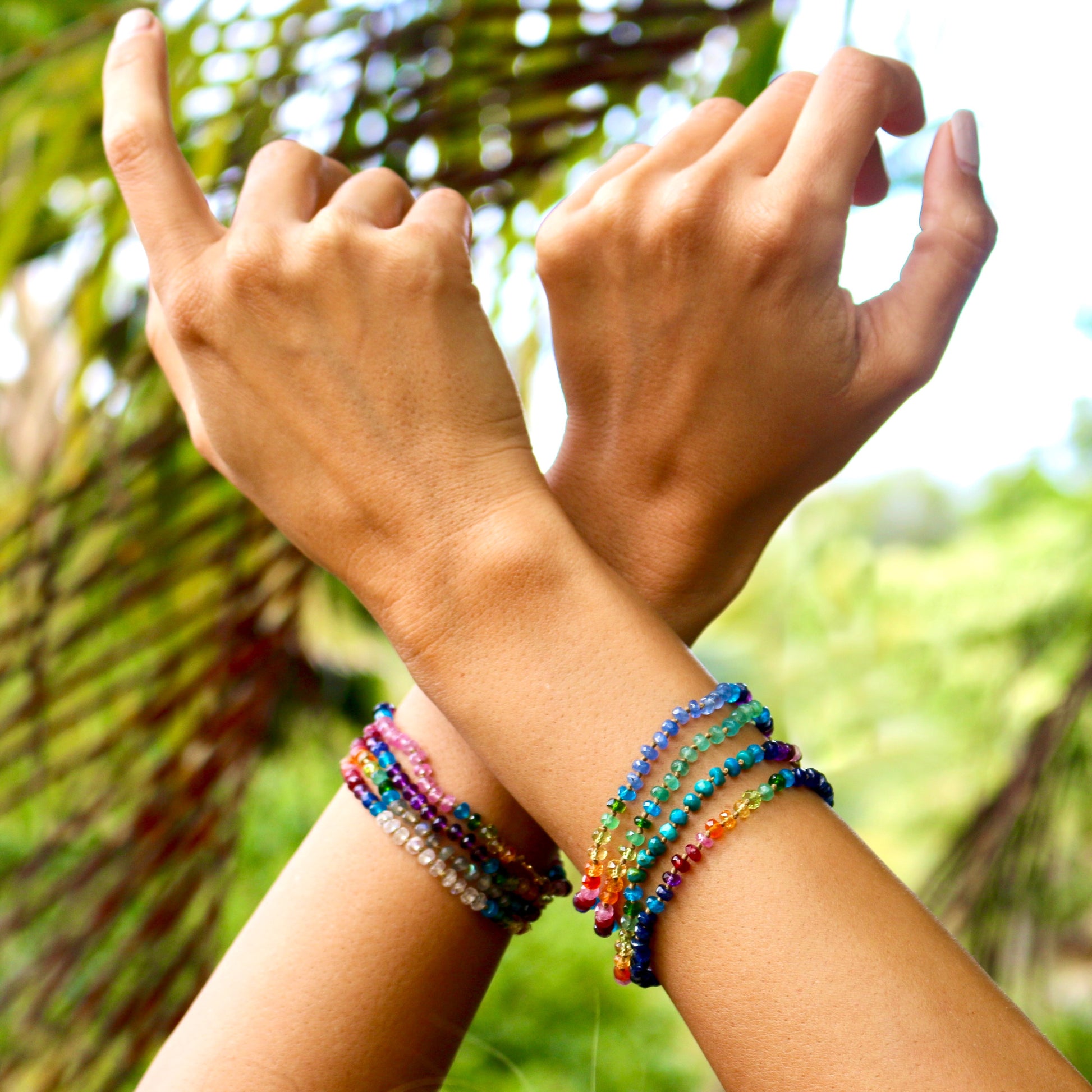 The hands are an extension of the heart, and as such, the wrists are a link between our passions and their expressions. As one of the most delicate joints in the body, they are responsible for movement, flexibility, dexterity, ease and skill. Celebrate, nourish, and embolden their expressions adorned in prismatic minerals that so eloquently highlight the finesse of love in action. Like all of Amalia’s pieces, our rainbow bracelets feature detailed knotting, precious gemstones, and a dash of uplifting rainbow magic. They also accent our other collections beautifully.